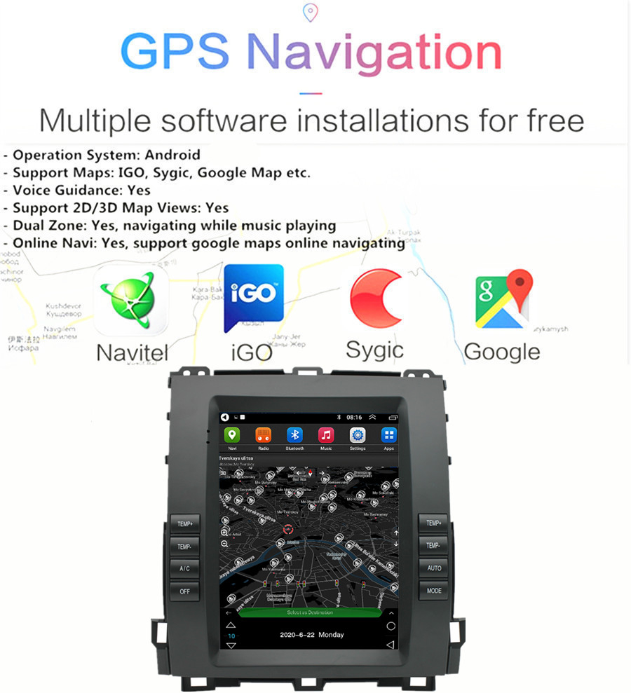 GPS | - Operation System: Android 11 - Support Maps: IGO, Sygic, Google Map etc. - Voice Guidance: Yes - Support 2D/3D Map Views: Yes - Dual Zone: Yes, navigating while music playing - Online Navi: Yes, support google maps online navigating |