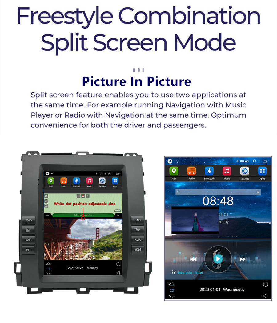Display | - Touch Screen: Yes - Resolution: 1024*768 - Capacitive or Resistance Screen: Capacitive - Built-in Clock and Calendar: Yes, show real time and can use network-provided time- Main Menu Status Bar display: Can be changed to Music/Radio/BT-Stereo Player and Clock/Date/Week - Change Apps-Icon Position: Yes - Spilt Screen: Yes Split screen feature enables you to use two applications at the same time. For example running Navigation with Music Player or Radio with Navigation at the same time. Optimum convenience for both the driver and passengers. |