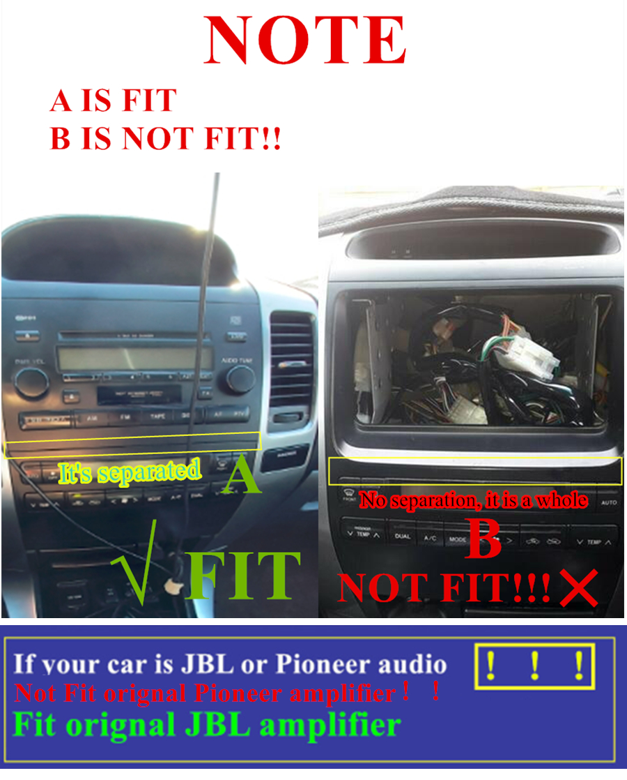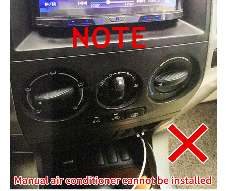 | NOTE | 1. Only fit for cars which original central control is two parts separated(There is a gap in the middle,not a whole),As picture show. 2.Fit for car with orignal JBL amplifier. 3.NOT Fit for car with orignal Pioneer amplifier. 4.NOT Fit manual air conditioner(As picture show) |