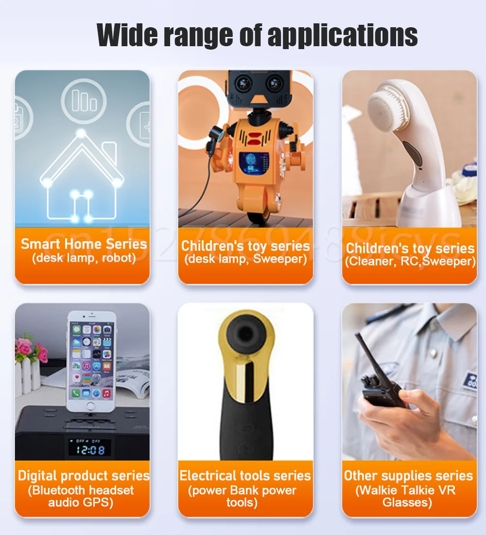 Applicable types: MP5, GPS, remote controller, mobile phone, iPod, tablet PC, Bluetooth speaker, headphone, camera, radio, portable DVD, MID, PDA, POS machine, solar lamp, interphone, for PSP, electric toys ect