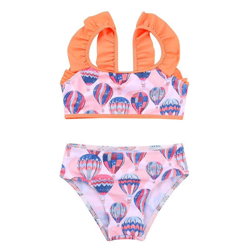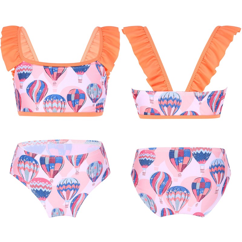 Swim tops with ruffled trim shoulder straps. Swim Briefs with stretchy waistband.