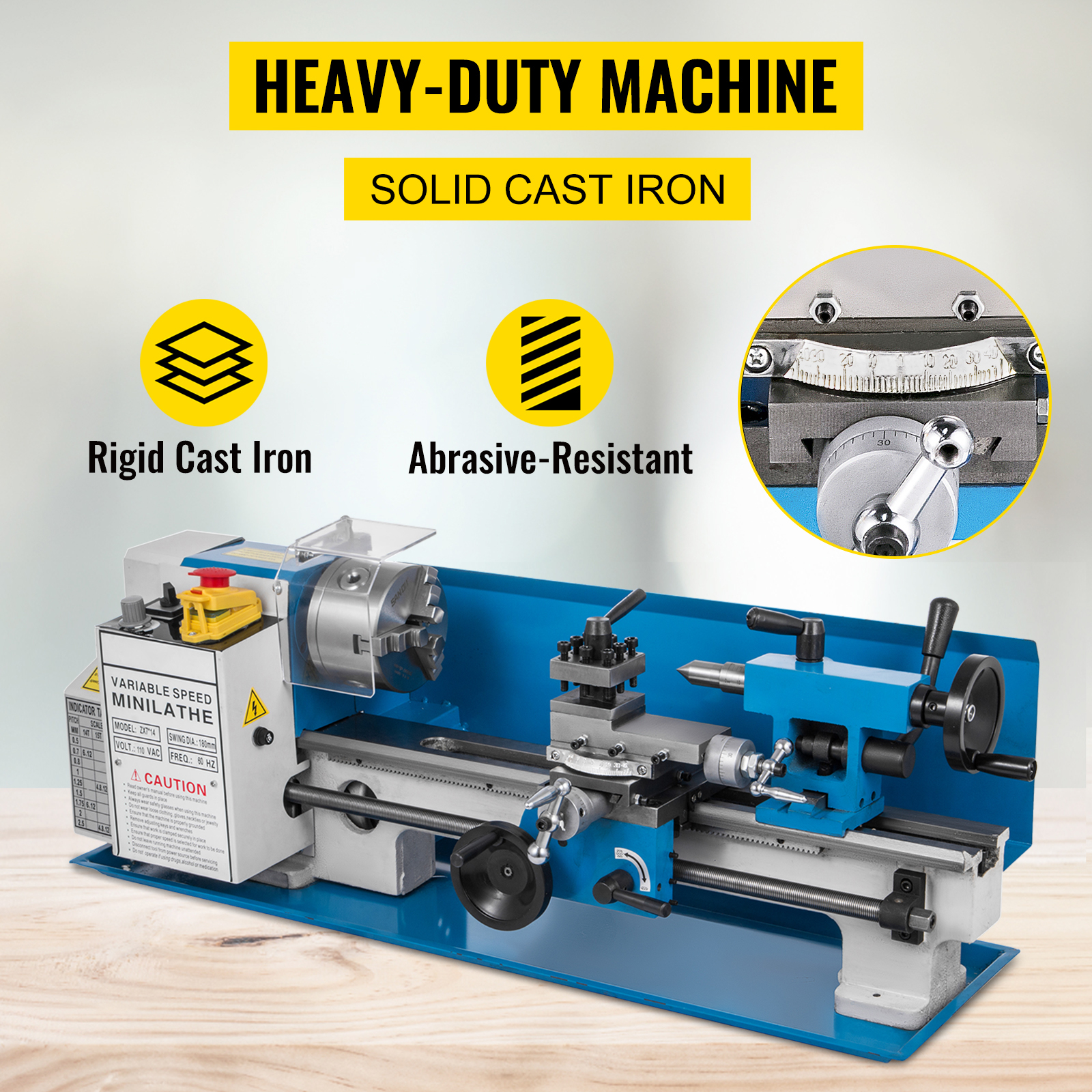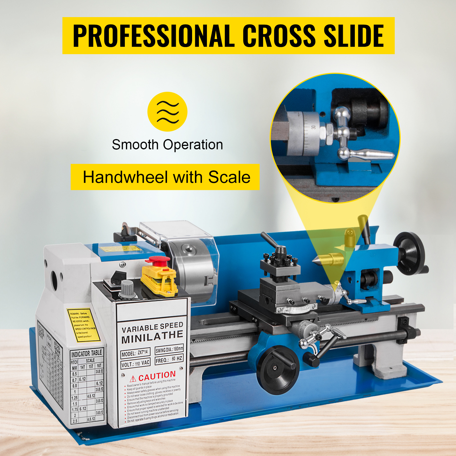 Crafted from premium iron, this machine is built to withstand years of heavy use. With a 7-inch swing over bed and a 13.78-inch distance between centers, it offers ample space for your projects. The wide through hole allows for easy work with long and thin pieces such as pins, bushings, axles, and shafts.