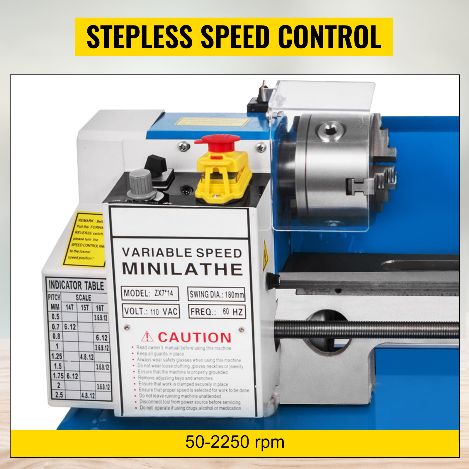 The SKYSHALO 7 x 14 Inch Precision Mini Benchtop Lathe is a reliable and efficient tool for all your metal turning needs. With its sturdy construction and high-quality materials, this lathe is built to last. The 3-jaw chuck ensures accurate and secure clamping of your workpiece, while the MT3 spindle taper and MT2 tailstock taper provide stability and precision. Equipped with a 3/4 HP motor, this lathe offers powerful performance and smooth operation. The variable speed control allows you to adjust the spindle speed from 50 to 2500 RPM, giving you full control over your turning projects. The two tranches spindle gear change speed control provides even more flexibility and versatility.The SKYSHALO 7 x 14 Inch Precision Mini Benchtop Lathe is designed for ease of use. Its simple and intuitive interface makes it suitable for both beginners and experienced users. The high-frequency quenching process and precision grinding of the high-quality cast iron bed ensure durability and accuracy.This lathe also comes with a movable lamp, providing you with ample lighting for your work area. Additionally, it features an emergency stop function for added safety. Experience the precision and reliability of the SKYSHALO 7 x 14 Inch Metal Lathe. Whether you're a professional or a hobbyist, this lathe is sure to meet your metal turning needs.