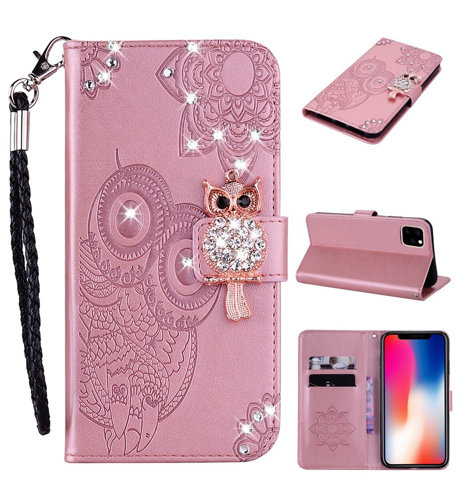 For iPhone 13 12 14 15 Pro Max 11 XR 8 Case Diamond Bling Owl Card Wallet Cover