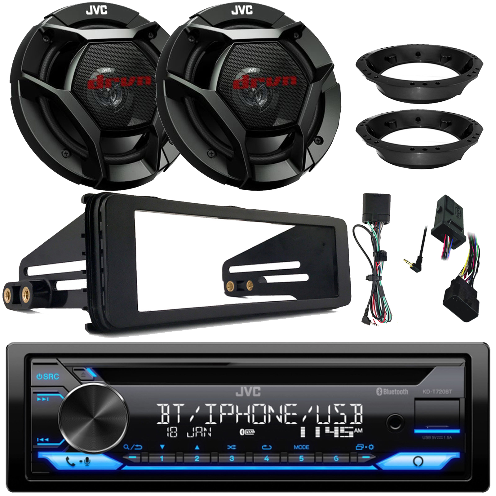 PACKAGE BUNDLE INCLUDES: JVC KD-T720BT Single DIN Bluetooth USB/AUX CD Player AM/FM Radio Multimedia Stereo Receiver, Single DIN Stereo Install Kit, 2x JVC CS-DR621 drvn DR Series 6.5" 300 Watt Max Power 2-Way Coaxial Speakers, Mounting Ring Adapter for 6.5" to 6.75" Speakers, Handlebar Control Interface
