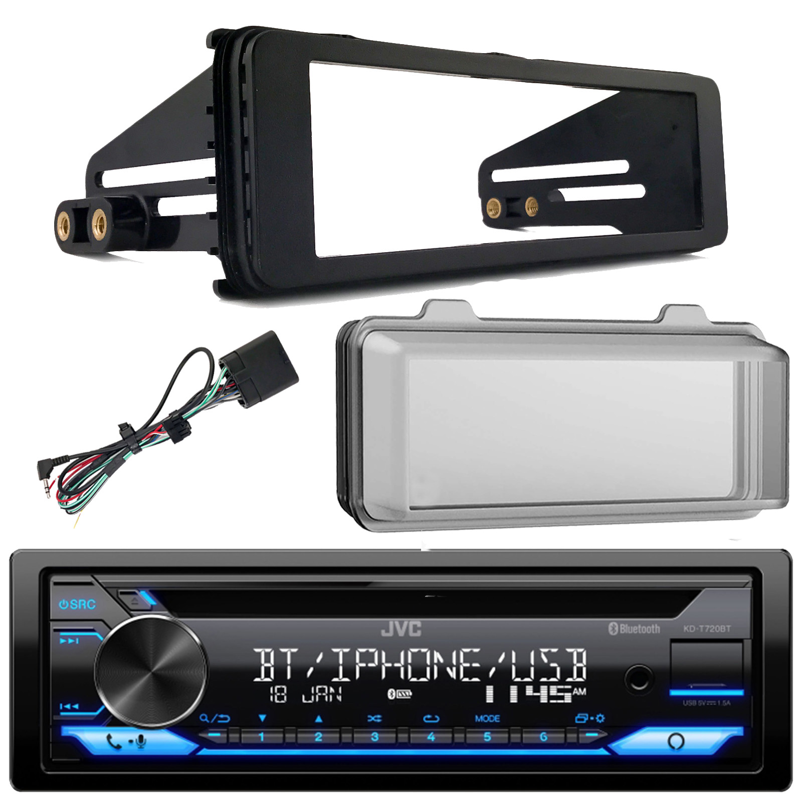 PACKAGE BUNDLE INCLUDES: JVC KD-T720BT Single DIN AM/FM USB AUX Bluetooth CD Stereo Multimedia Car Audio Receiver Bundle with Harley 98-2013 Radio Install Kit, Weathershield Radio Cover