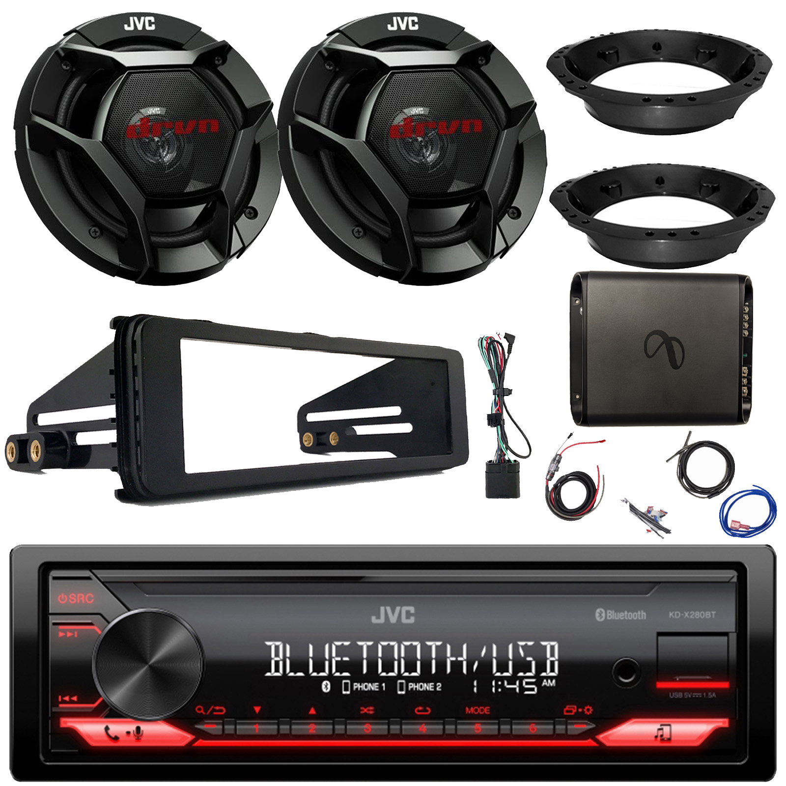 PACKAGE BUNDLE INCLUDES: JVC KD-X280BT Single Din Bluetooth USB/AUX AM/FM Radio Digital Media In-Dash Stereo Receiver, Single-DIN Stereo Installation Kit, 2x JVC CS-DR621 drvn DR Series 6.5" 300 Watts Max Power 2-Way Coaxial Speakers, Mounting Ring Adapter for 6.5" to 6.75" Speakers, Infinity Alpha 1302A 65W RMS x 2 @ 4 Ohms 2-Channel Class AB Amplifier, 8 Gauge Amplifier Wiring Kit (Bundle Fits Select 1998-2013 Harley Davidson Motorcycles Models, HD Touring)