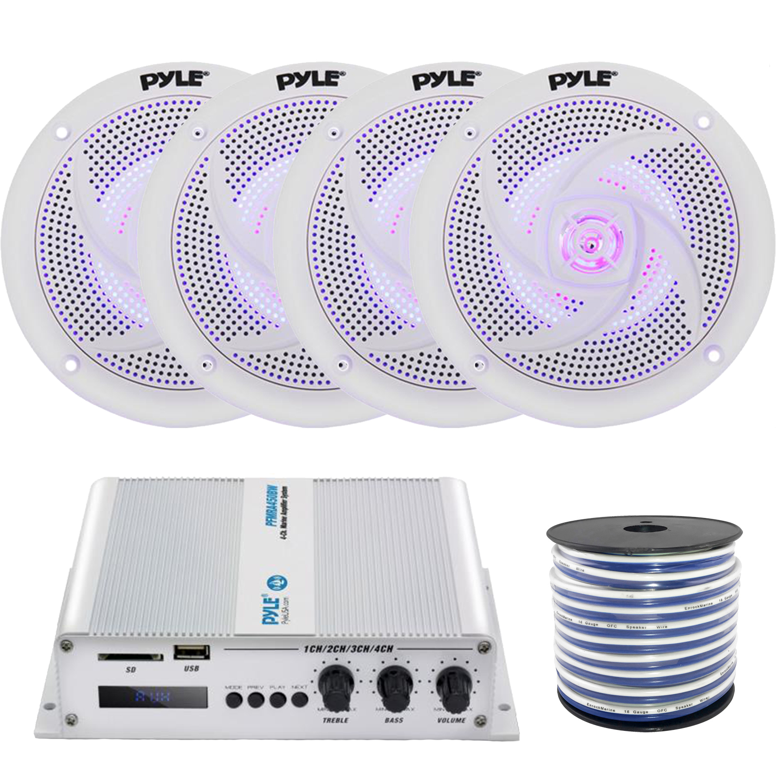 4 x Pyle 5.25" 2-Way Marine 180W Audio Stereo LED Speakers, Pyle 4-Channel Bridgeable Compact Boat Yacht Waterproof 400W RMS Amplifier, Enrock Marine-Grade 18-Gauge Speaker Wire