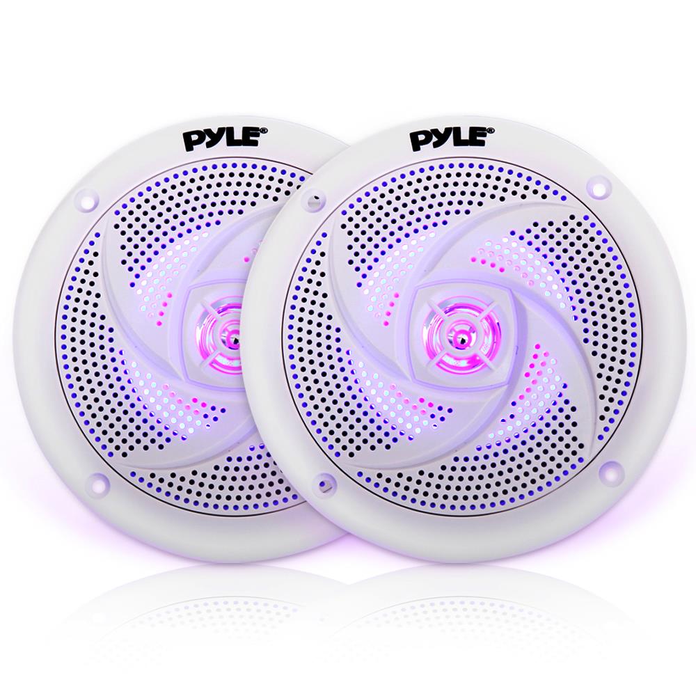 5.25" LED SPEAKERS: These Pyle PLMRS53WL marine speakers are constructed with aluminum materials and other durable substances for a rugged sound system. The speakers are also waterproof to withstand water and weather resistant to combat sun damage. They even have LED lights for an added touch. With a 2-way full range stereo sound reproduction and 180 watts of max pwoer, these speakers will provide you with an impressive sound output.
