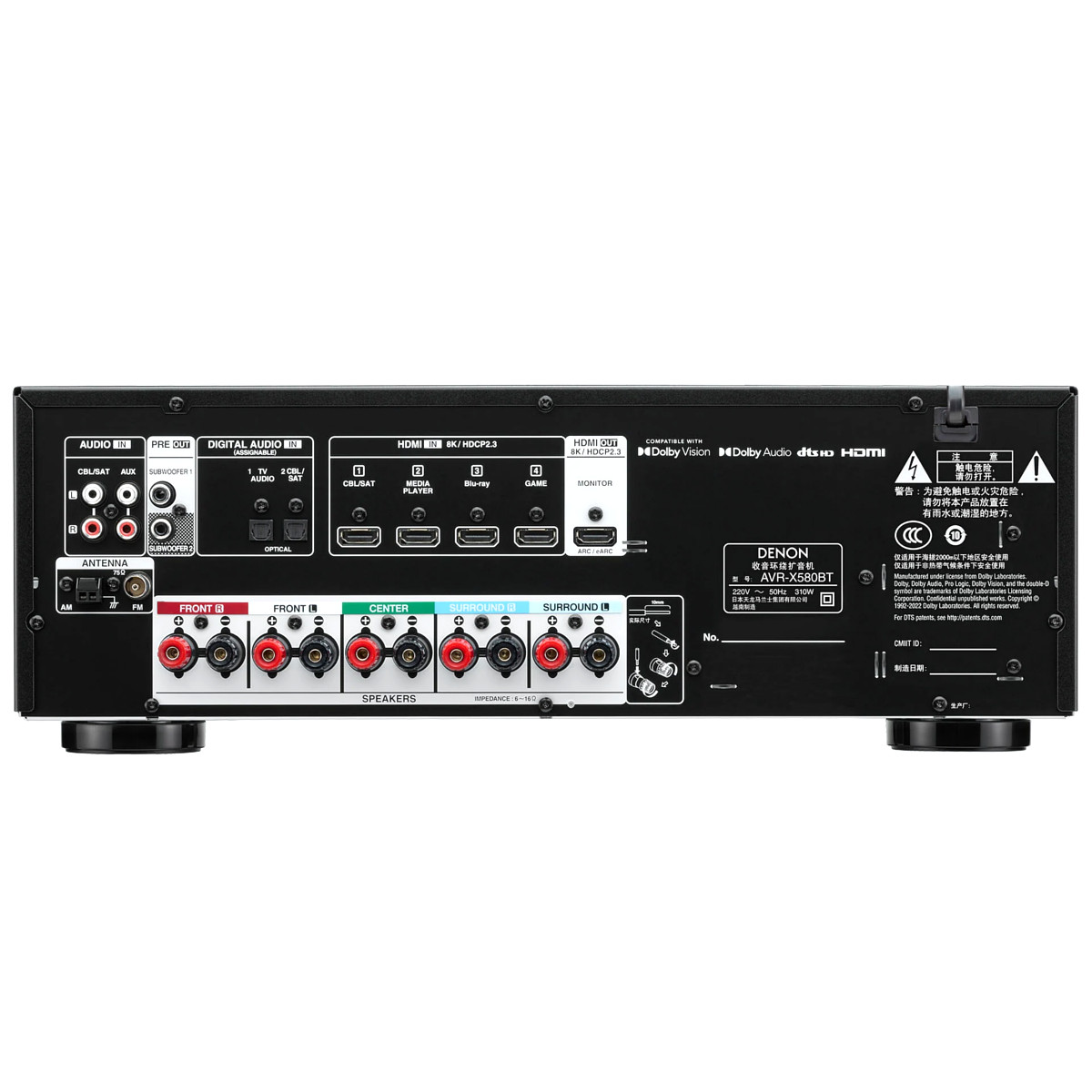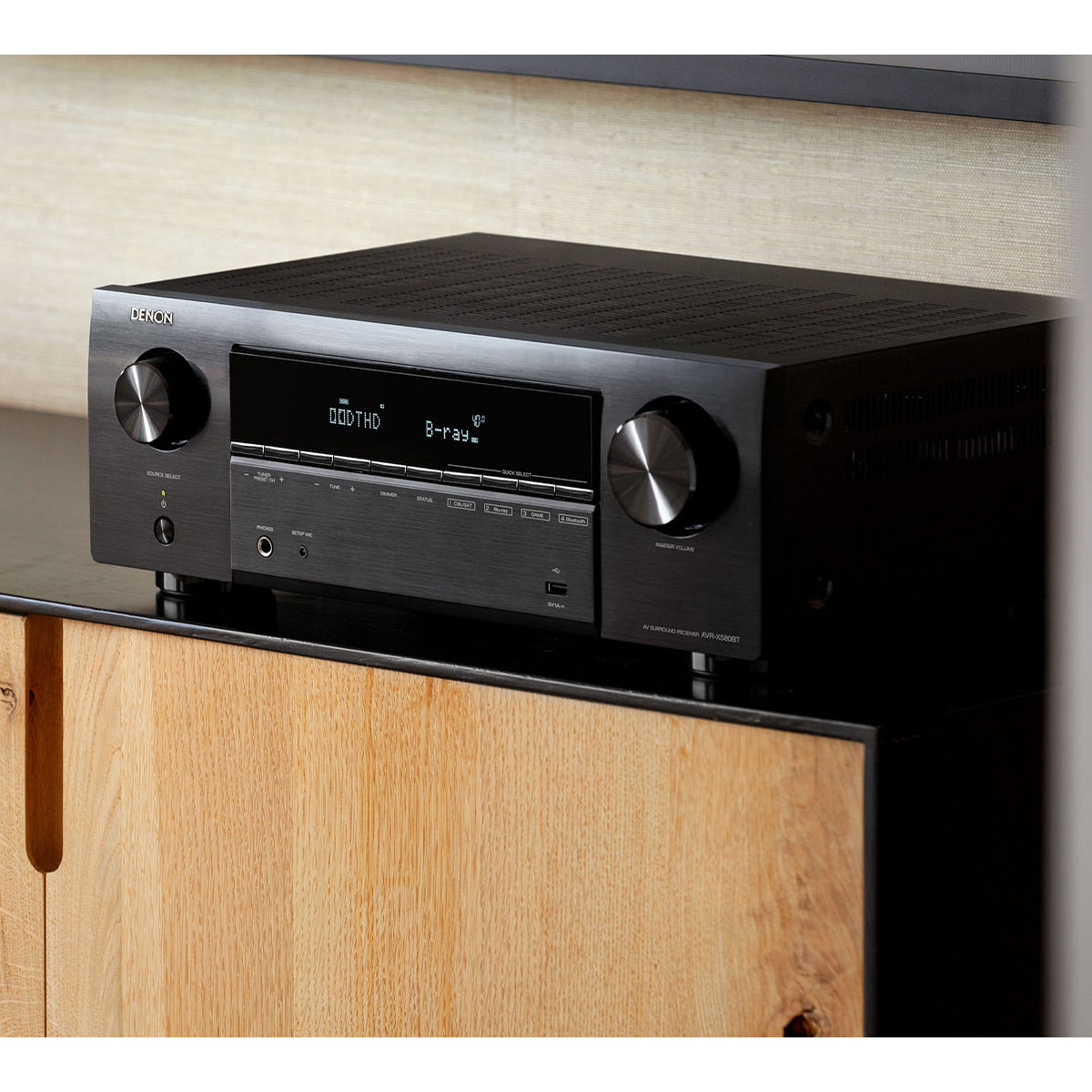 The AVR-X580BT supports high-fidelity lossless audio including DolbyTrueHD and Dolby Digital, DolbyDigital Plus signal decoder, and Dolby Pro Logic II upmixer for 2-channel audio signals to create a full 5.1 surround sound experience.
