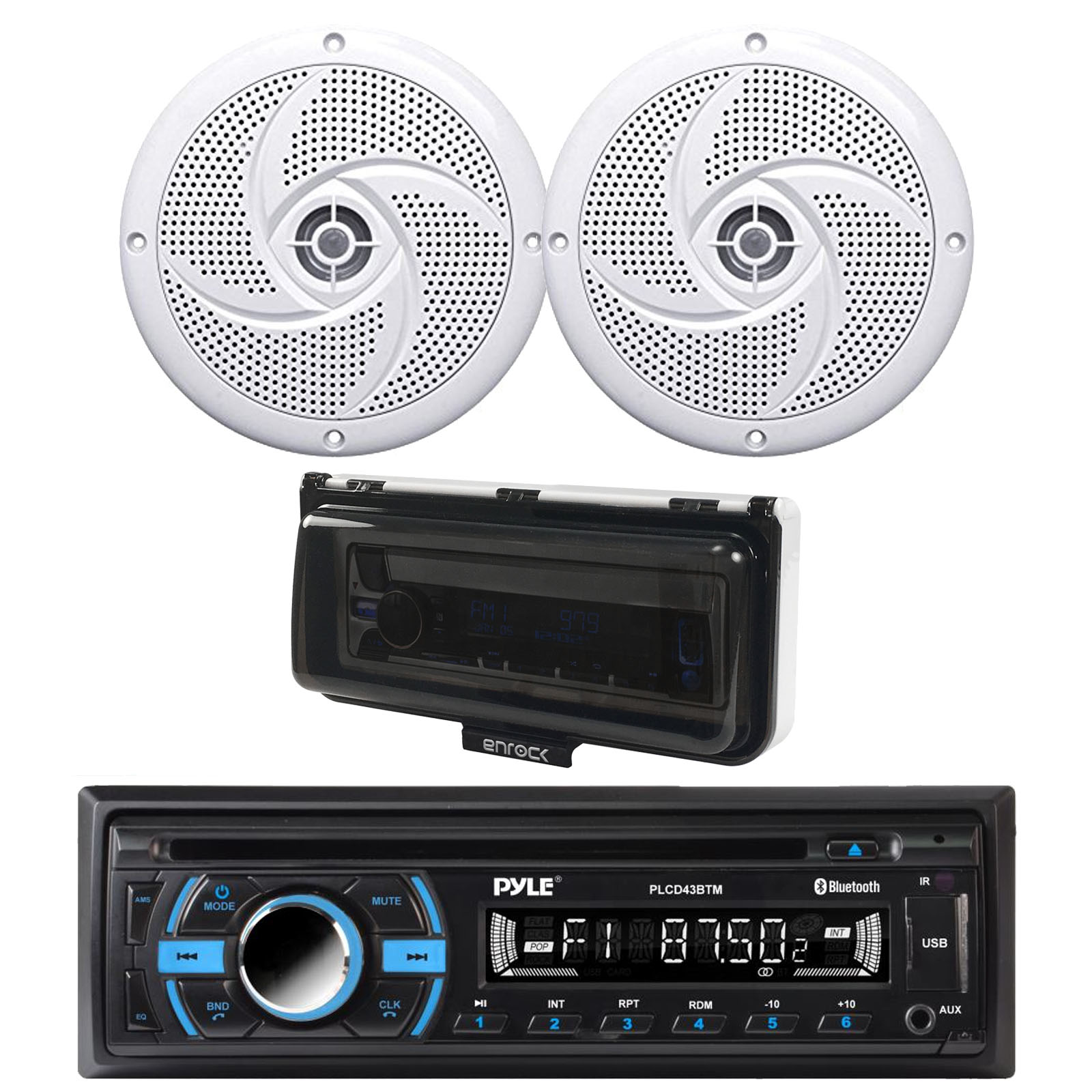• PACKAGE BUNDLE INCLUDES: Pyle PLCD43BTM Single Din Marine MP3/USB/AUX Bluetooth AM/FM CD Stereo Receiver, 2x 4" 100 Watt Max Power Low Profile 2-Way Waterproof Outdoor Audio Speakers, Stereo Cover (White)