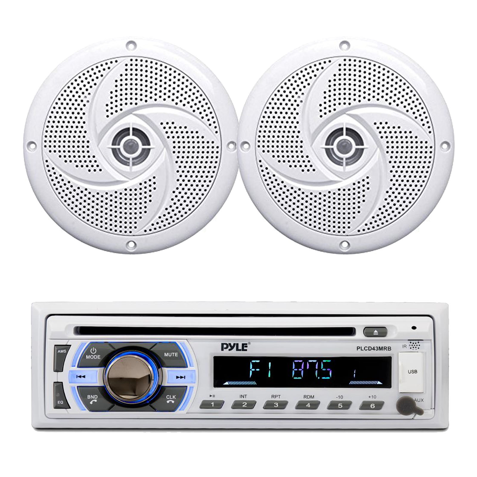 • PACKAGE BUNDLE INCLUDES: Pyle PLCD43MRB Single Din Marine MP3/USB/AUX Bluetooth AM/FM CD Stereo Receiver, 2x 5.25" 180 Watt Max Power 2-Way Low Profile Waterproof Boat Audio Speakers (White)