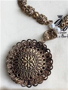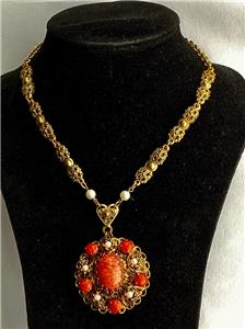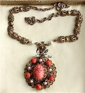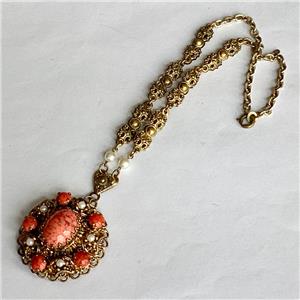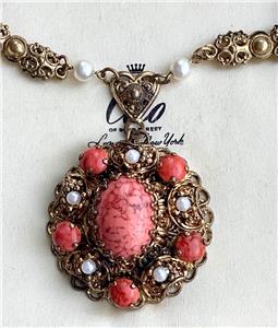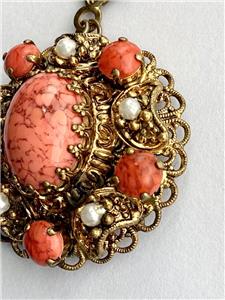 It is gold tone metal and has an ornate chain with pearls at the end simply stunning pendant which is quite large it measures 3.5 cm across and is very ornate with faux pearls and a large oval of coral glass cabochon .The necklace measures 14 inches and has a bolt and ring catch upon which is the signature