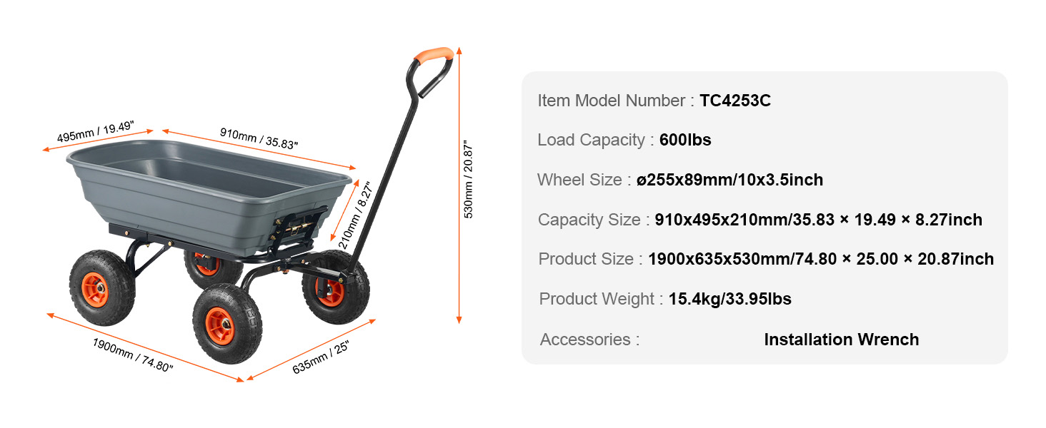 This garden cart with a sturdy thick metal frame, is capable of handling up to 600 lbs of weight. Its generous 4 cu. ft capacity makes each transportation a breeze.