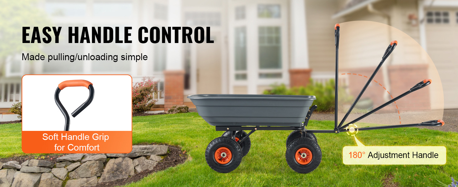 Convenient Front-Handle Dumping: The innovative front-handle dumping frame allows for quick and easy unloading of items. Simply disassemble the bottom of the frame to transform it into a garden dump cart. The 180° adjustable handle ensures effortless maneuvering, doubling your efficiency.