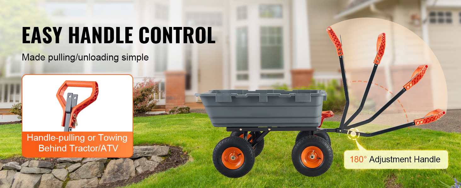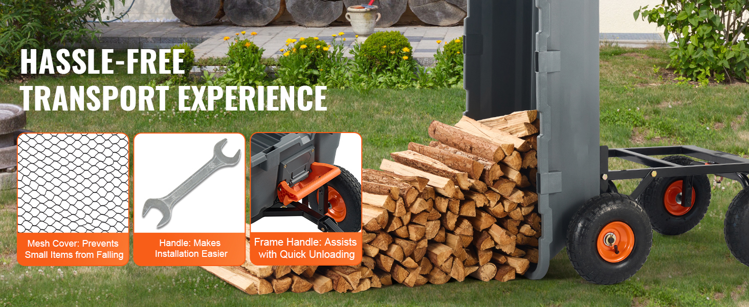 This garden cart with a sturdy 1.2" thick metal frame, is capable of handling up to 1200 lbs of weight. Its generous 6.48 cu. ft capacity makes each transportation a breeze.