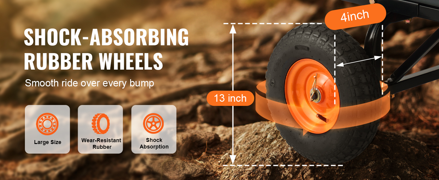 Navigate uneven garden terrain or grassy slopes with ease using the KFFKFF dump cart's 13" rubber tires. These large tires provide excellent shock absorption, ensuring a smooth and stable transport.