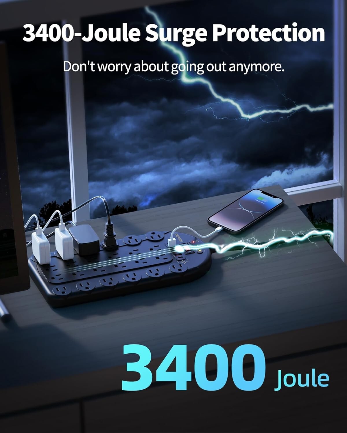 Don't settle for a basic power strip when you can have the ultimate power station with our Sleek Black Power Strip Surge Protector. With 24 outlets, 6 USBs, 2 USB-C ports, and 3400J surge protection, this power strip has everything you need to power all your devices in one place. The widely spaced outlets and flexible design make it perfect for any environment, whether it's your home, office, or gaming room.