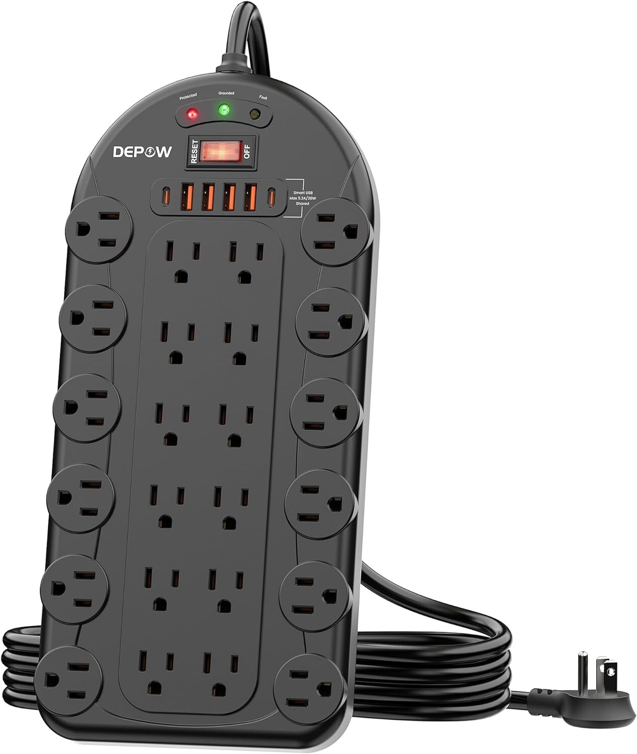Sleek Black Power Strip Surge Protector: 24 Outlets, 6 USBs, 2 USB-C, 8FT Cord