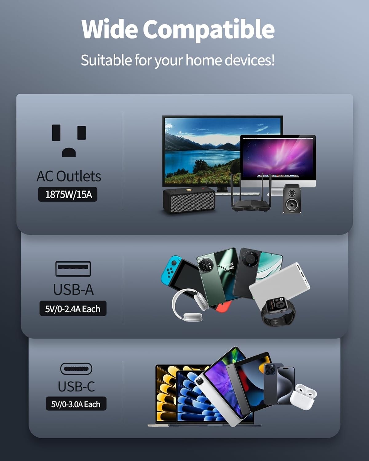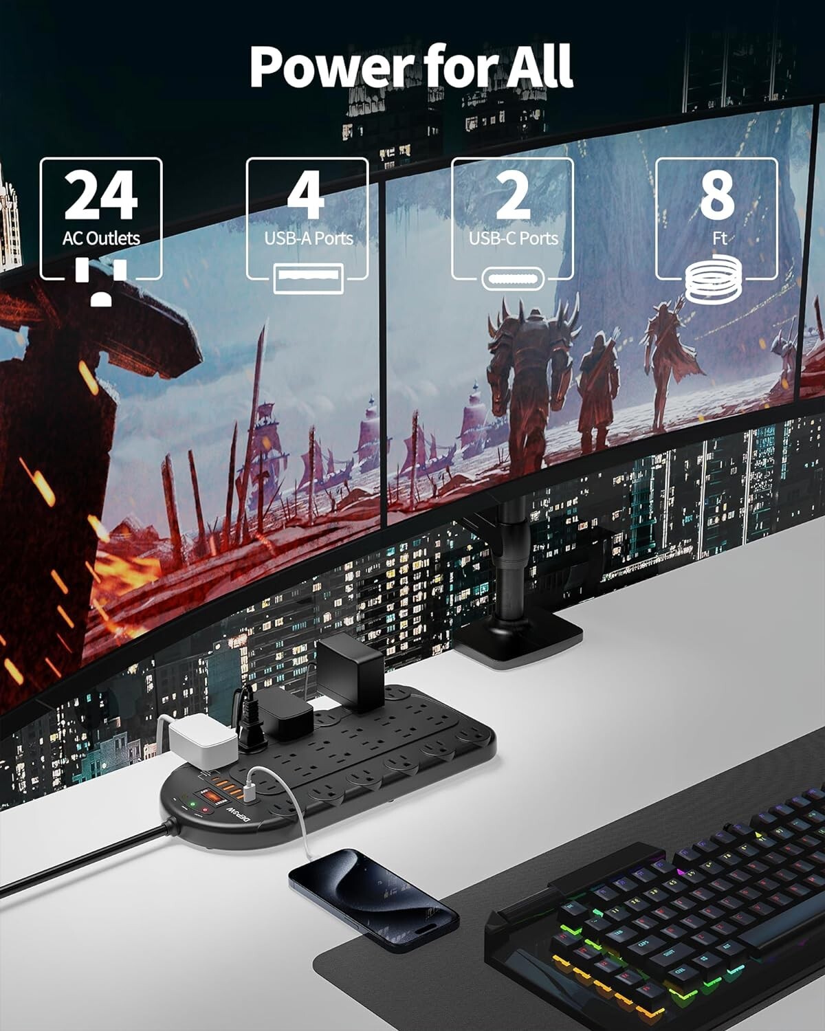 -24 Outlets, 6 USBs, 2 USB-C, 8FT Cord