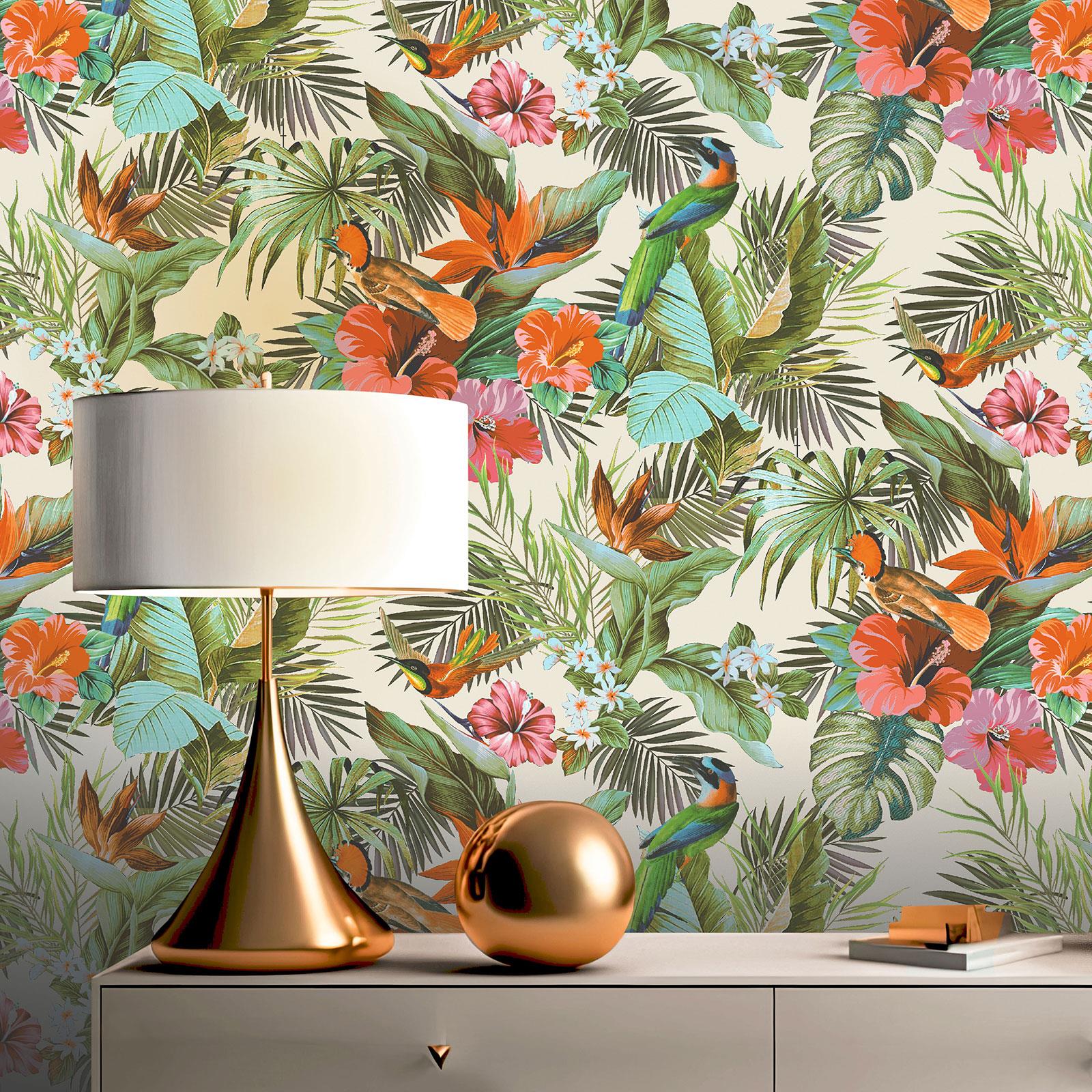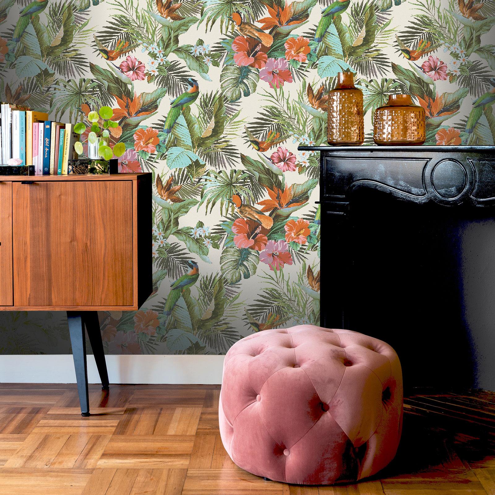 Make a bold statement with Paradise Birds wallpaper, this textured heavyweight vinyl will look trendy on your walls!. The design features exotic birds flying amongst tropical leaves and hibiscus flowers using embossed textures, set on a woven-effect background with a subtle sheen finish. This high quality and heavyweight wallpaper is easy to use and can cover any imperfections or bumps on your walls. Don't forget to order a sample to get a feel for our designs before ordering full rolls!