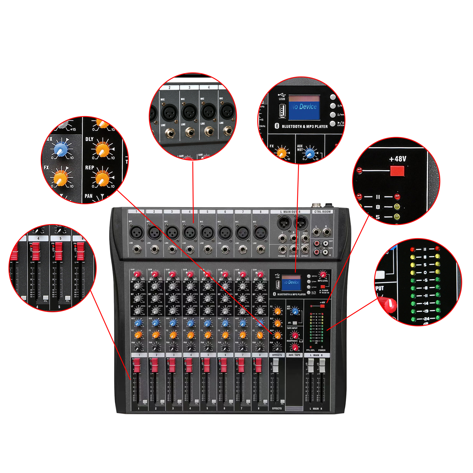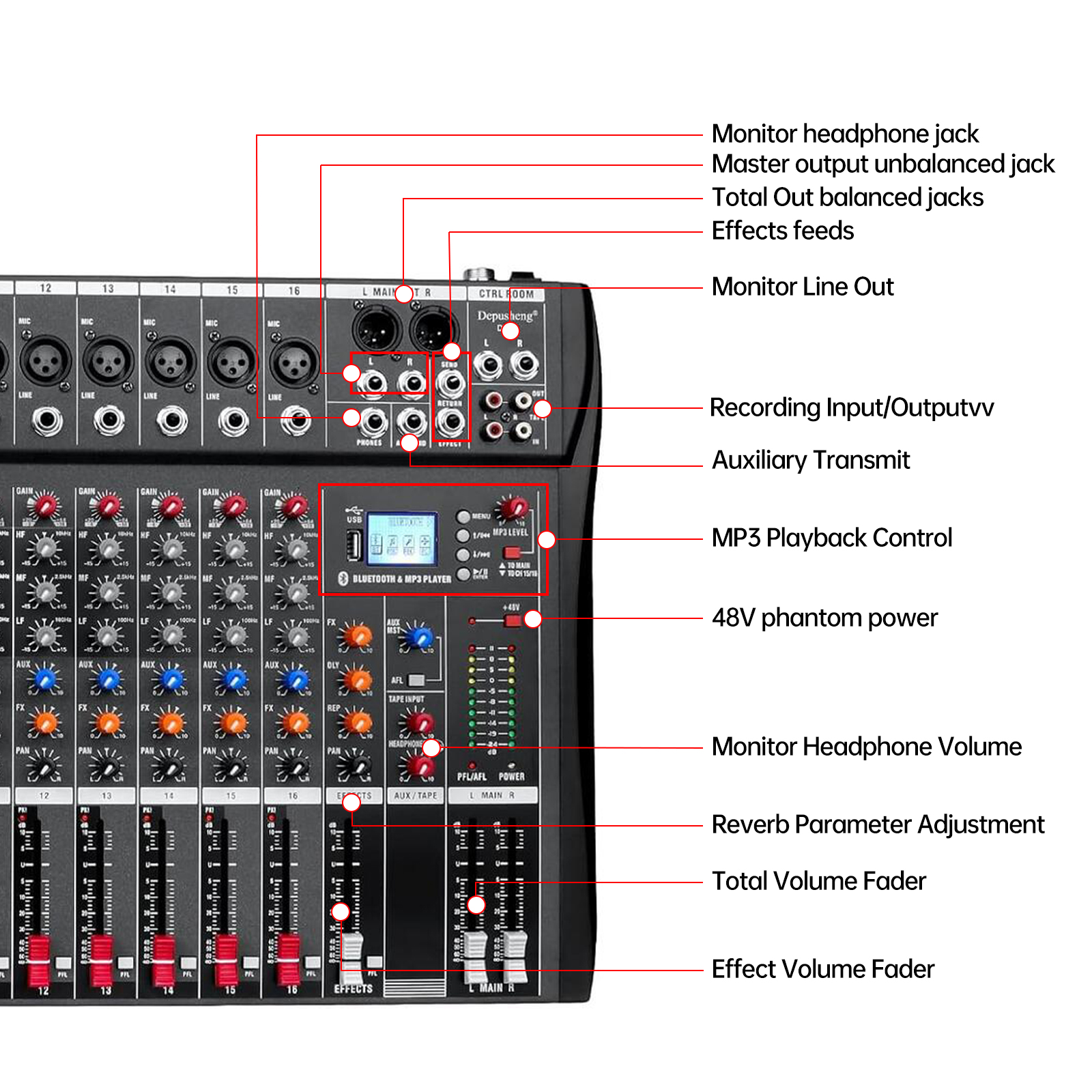 Features: 60mm high analytical durability fader, 3-band frequency input, Built-in + 48V phantom power, digital reverb effect. HD headphone output port, MP3 player, Bluetooth connection playback. USB - computer recording and sound editing function. Support SD/TF card, etc.