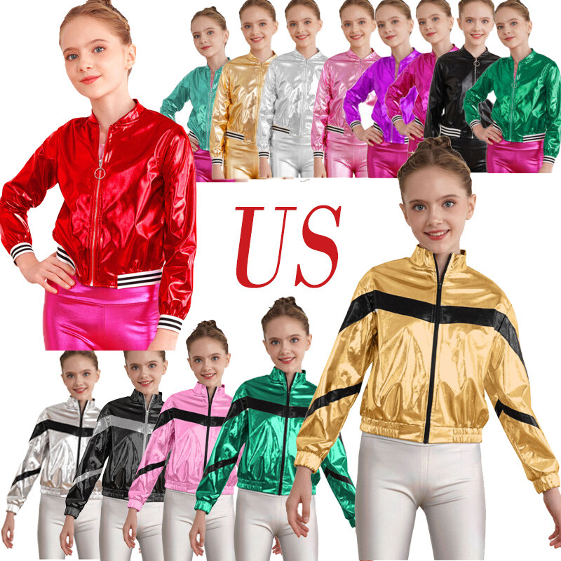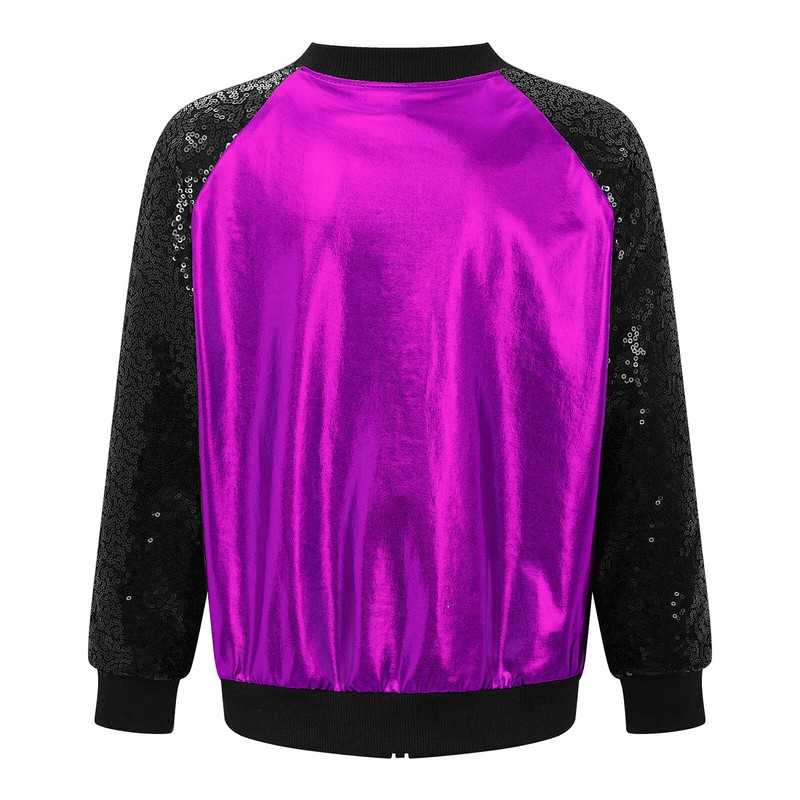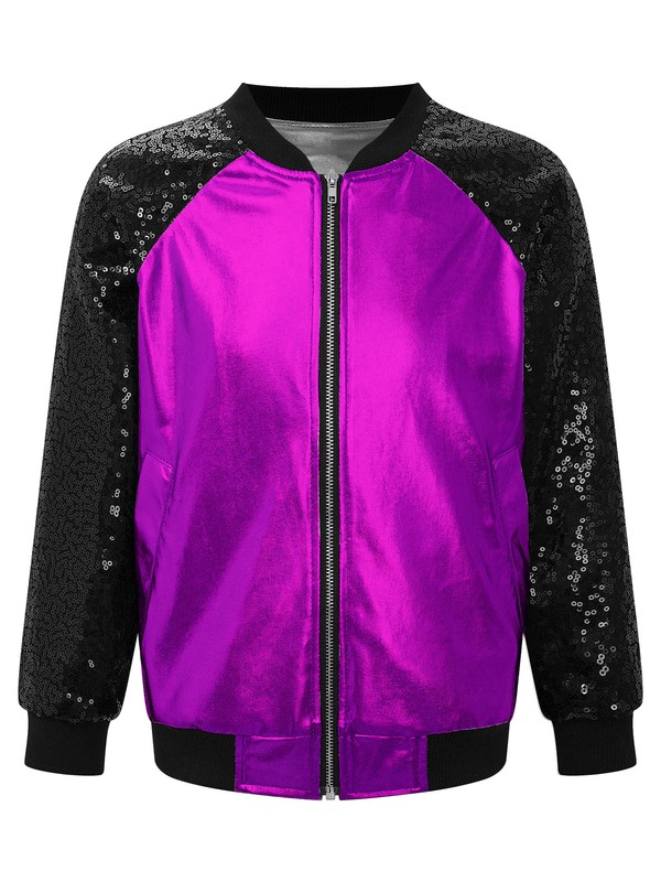 Kids Girls Shiny Sequins Long Sleeve V Stand Collar Zipper Closure Front Bronzing Cloth Jacket Outerwear.