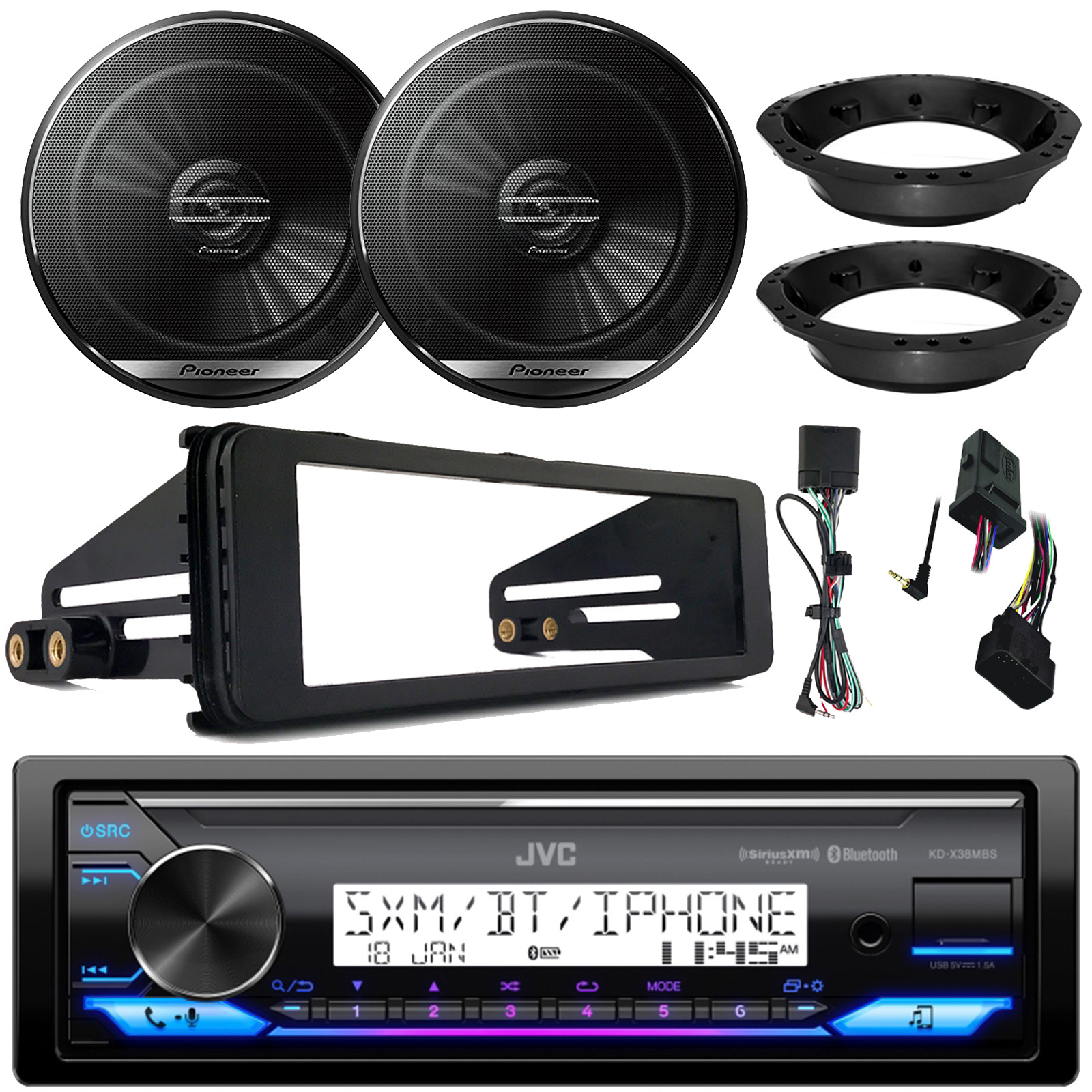 PACKAGE BUNDLE INCLUDES: JVC KD-X38MBS Single DIN Marine MotorSports Bluetooth USB/AUX LED Illumination AM/FM Radio SiriusXM Ready Stereo Receiver, Single-DIN Stereo Installation Kit, 2x Pioneer TS-G1620F 6.5" 300 Watt Max Power 2-Way Coaxial Speakers, Mounting Ring Adapter for 6.5" to 6.75" Speakers, Handlebar Control Interface (Bundle Fits Select 1998-2013 Harley Davidson Motorcycles Models, HD Touring)
