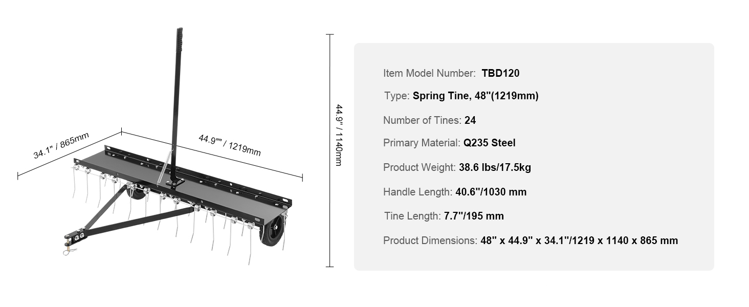 Product Specifications: The lawn dethatcher rake features a 48'' working width. Spring tines size: 3 coil T4.5x195 mm, 24 tines, product weight: 38.6 lbs.