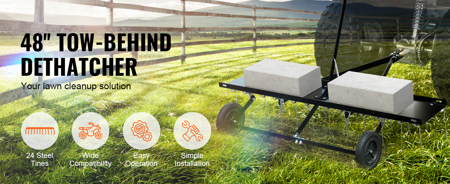 Effective Weed Removal: The tow-behind dethatcher features 24 sturdy, sharp steel tines with a 48'' working width, efficiently cleans withered grass, removes branches, and collects leaves, hay, and other materials. It is far more efficient than traditional hand tools and leaf rakes.