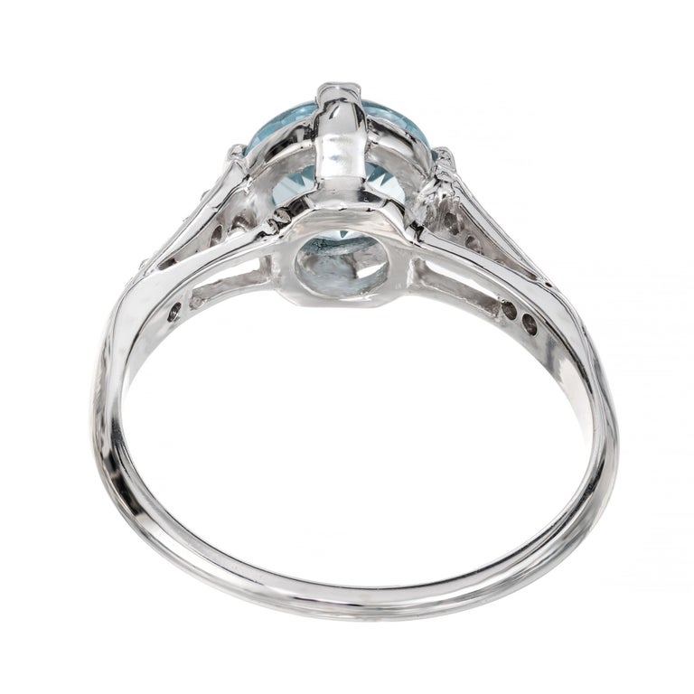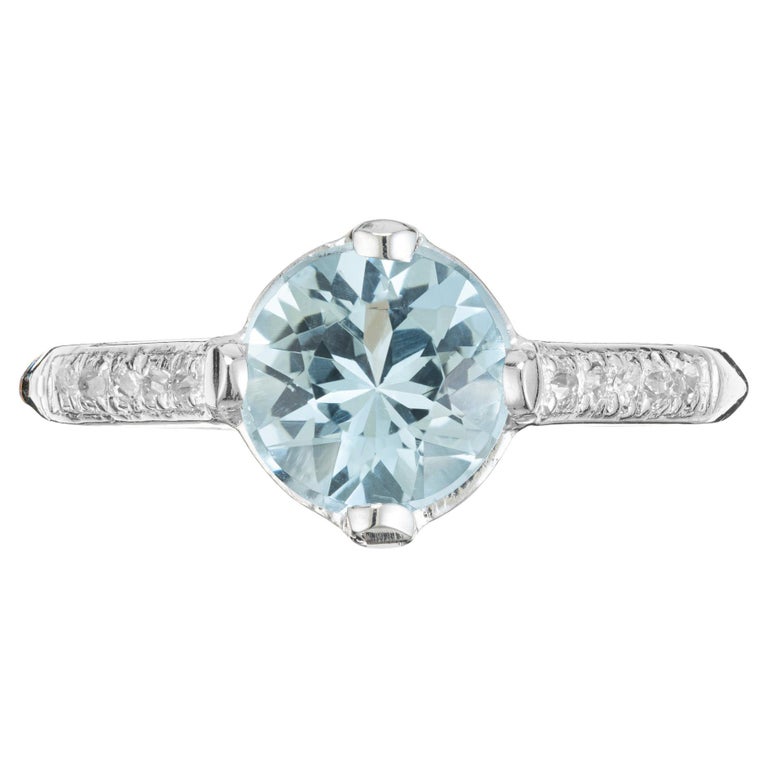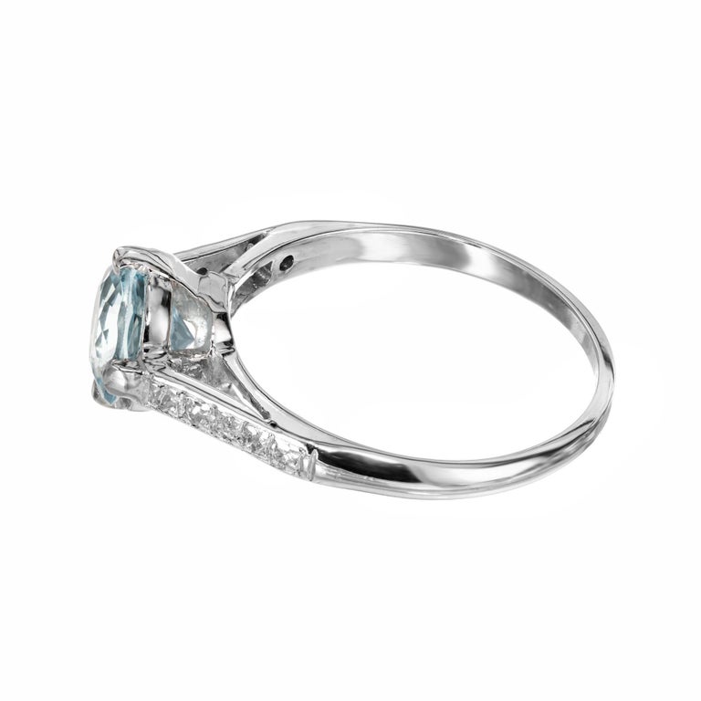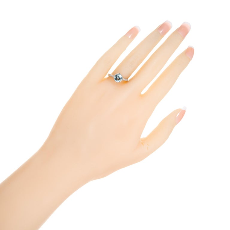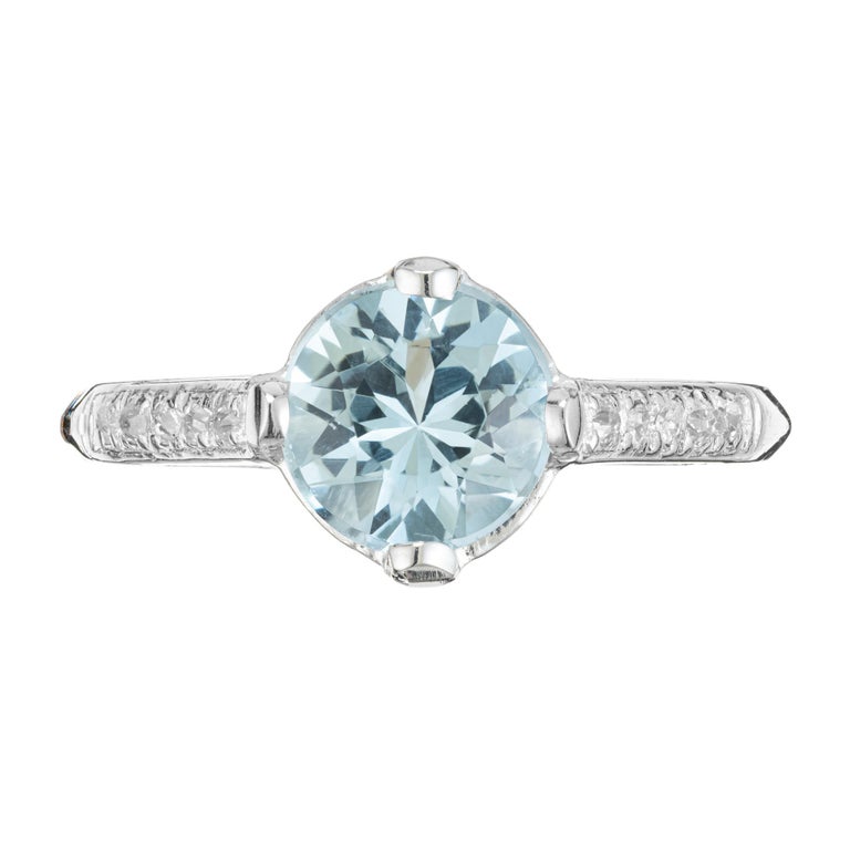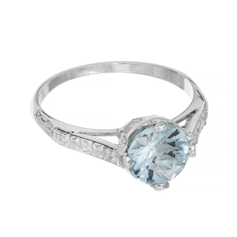 Aqua and diamond engagement ring. Beautiful bright round aquamarine center stone measuring 1.11cts. Mounted in a platinum four prong setting accented with 5 single cut diamonds along each shoulder. This vintage ring dates back to the 1930's.