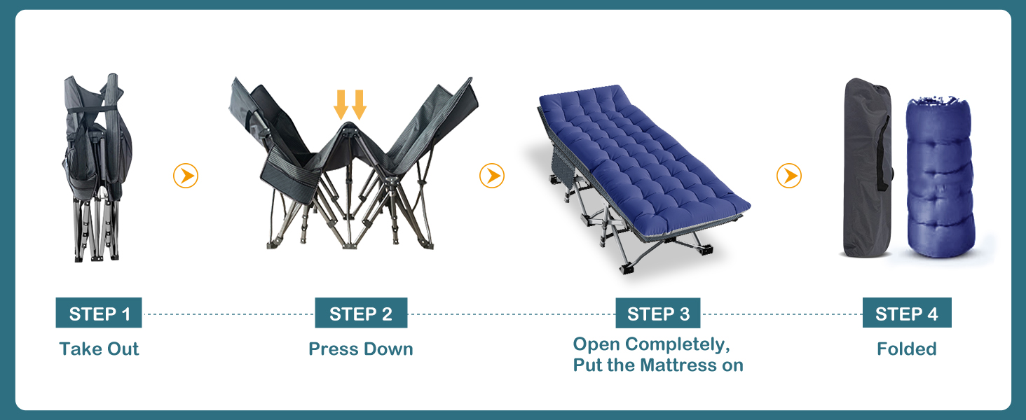◊The folding cot may be a little tight when first opened, the bed will be flattened by pressing the middle of the bed with your hand and pressing the other end of the bed with the other hand. If you accidentally pour water onto the folding bed during use, please dry it and then fold it up. When not in use, please put it in the carry bag and store it in a dry and ventilated environment to make the product last longer.
