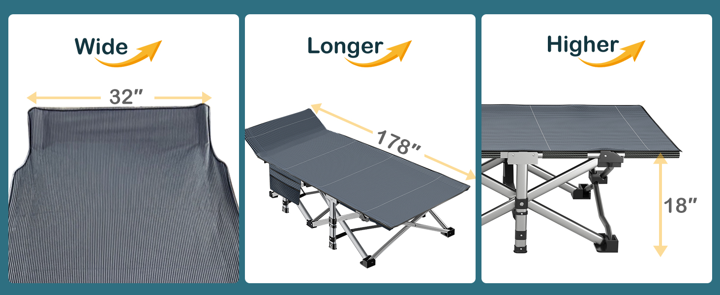▶【Heavy Duty Sleeping Cots】 The folding camping cots is made of high quality material, strong and sturdy. Upgrade the bed surface, square anti-rust steel frame, durable thicker pipe and double layer 1200D Oxford cloth, water resistance and easy cleaning, excellent strength and more durable to use, supports up to 900 lbs.