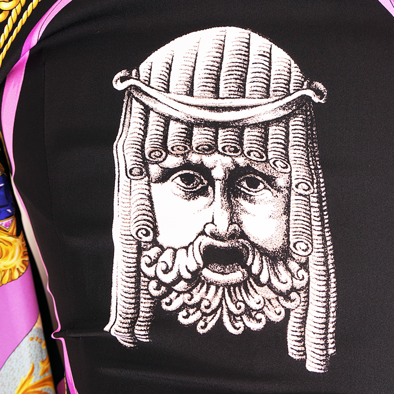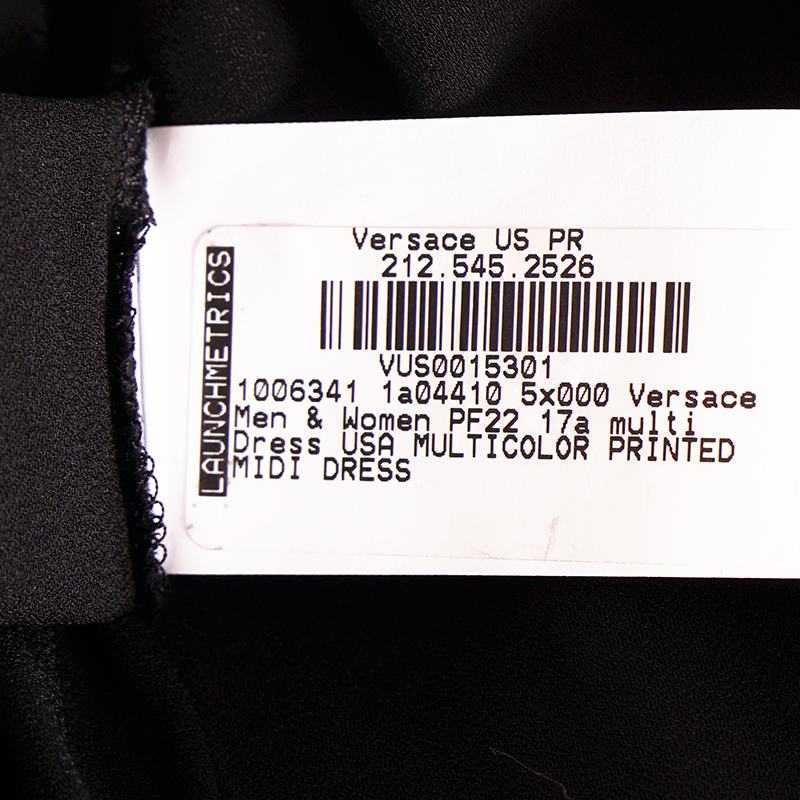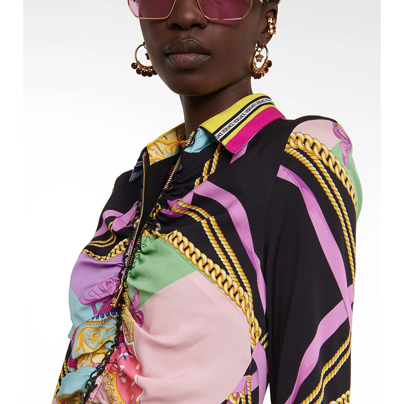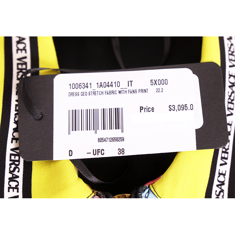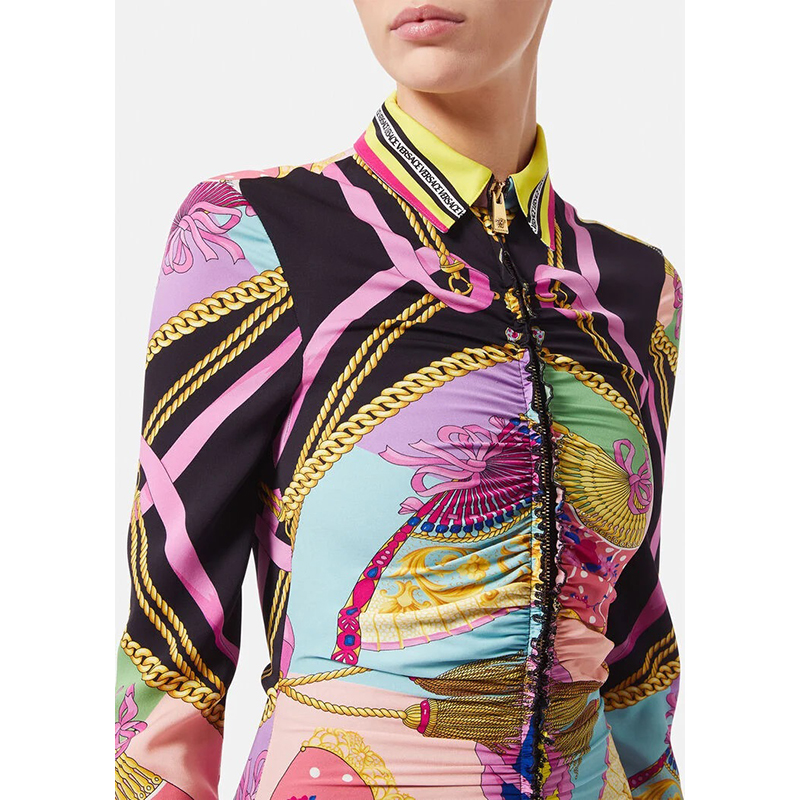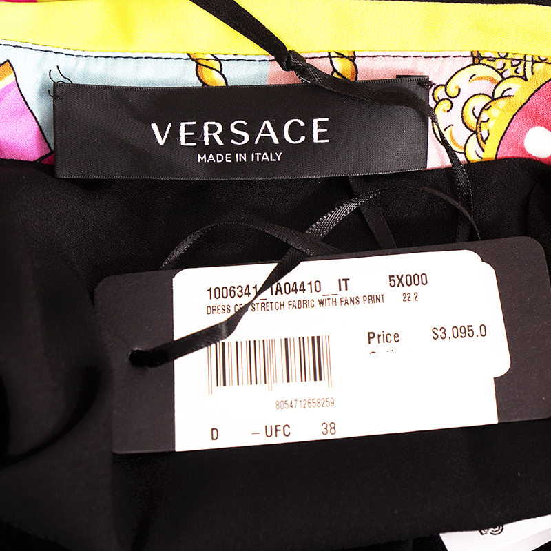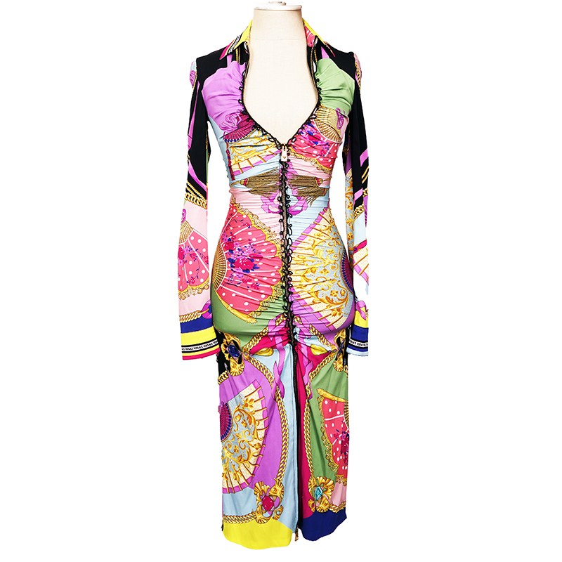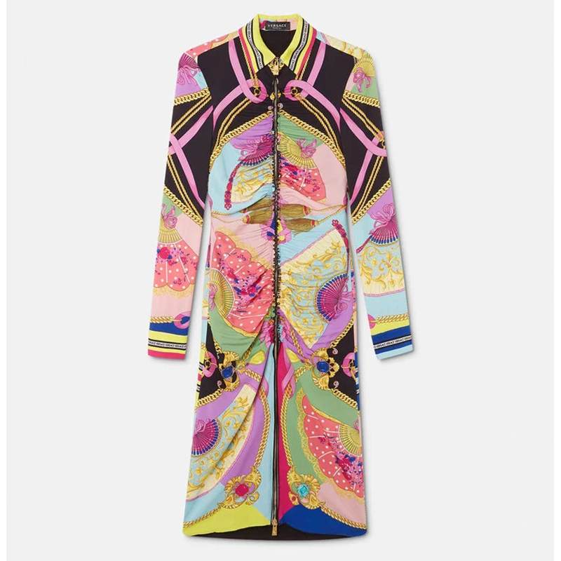 Authentic Versace in an enchanting print and cut. Vivid multi-color fan and baroque glamour print. Shirtdress style spread collar. Quick and easy zip front closure with Medusa head logo zipper pull. Long sleeves with button cuffs. Large Greek head in back. Form fitted style, really hugs the curves. 94% silk, 6% elastane. Style 1006341. Made in Italy. Very hard to find dress, sure to get noticed.