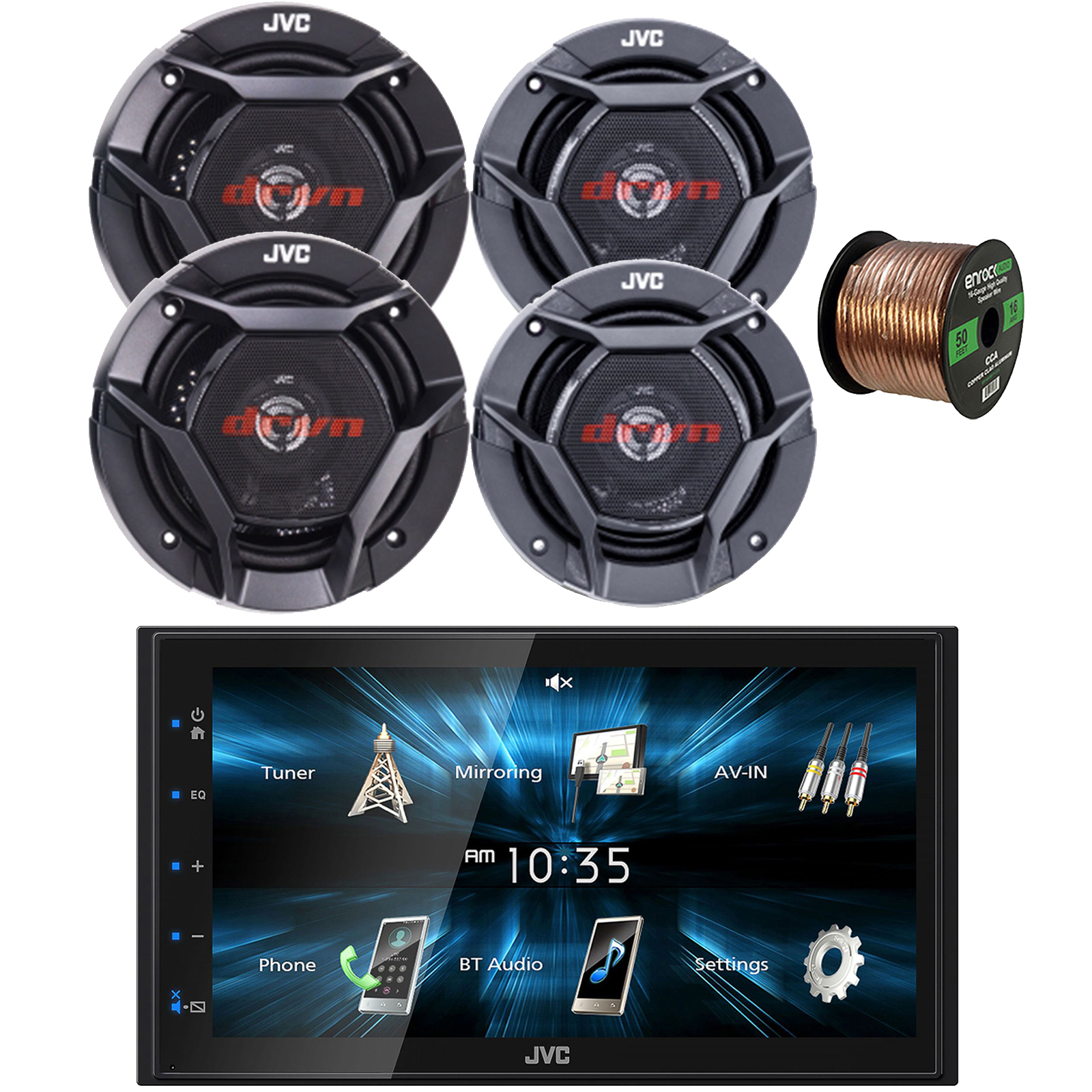 • PACKAGE BUNDLE INCLUDES: JVC KW-M150BT 6.8" WVGA Touchscreen Double DIN Digital Media Bluetooth USB AM/FM Stereo Receiver, 2x JVC CS-DR521 drvn DR Series 5.25" 260W Peak Power 2-Way Coaxial Car Audio Speakers, 2x JVC CS-DR621 drvn DR Series 6.5" 300W Max Power 2-Way Coaxial Automotive Speakers, Enrock EB16G50FT-CCA 16 Gauge 50 Feet Speaker Wire
