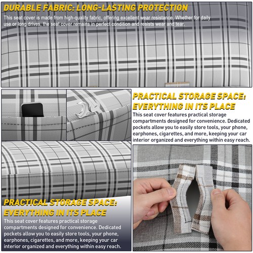 Specifics Color: Black+grey+white Recommended Uses: Universal For Bench Special Feature: Wear Resistant, with Pocket & seat belt holes Pattern: Striped Woven Look Closure Type: Ties