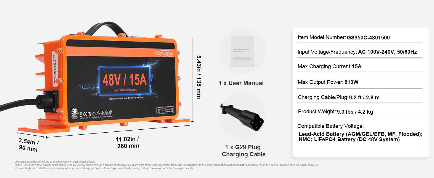 Our lithium golf cart battery charger offers various plug options, including Crowfoot Plug, D-Style Plug, RXV Plug, G29 Plug, and 3-Pin Round plug. This flexibility ensures compatibility with your specific needs, so you get the perfect fit for your equipment.