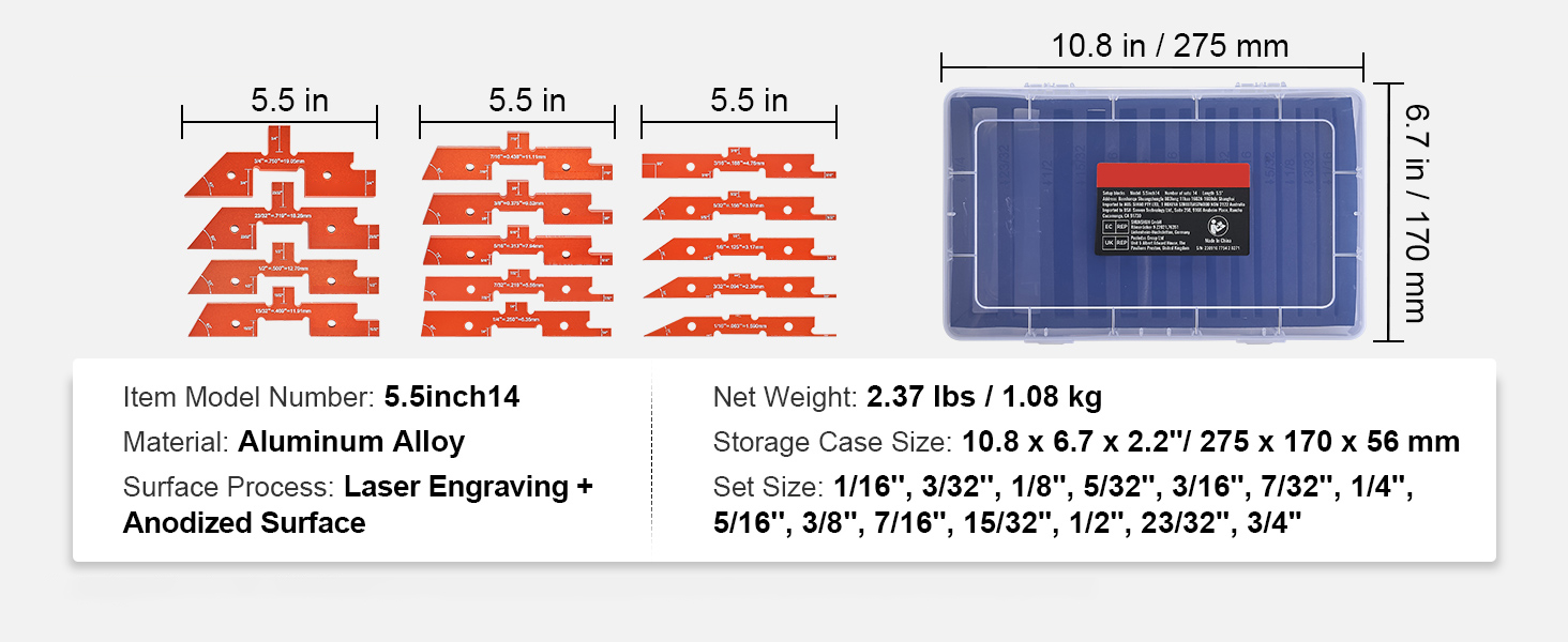 VEVOR 4-in-1 woodworking setup block bars can be used as a height gauge, depth gauge, square stacking, and angle gauge! This 14-piece set boasts a range of sizes with precision up to 0.001 in, crafted from aluminum alloy with laser-engraved scale markings for high accuracy and long-term use.