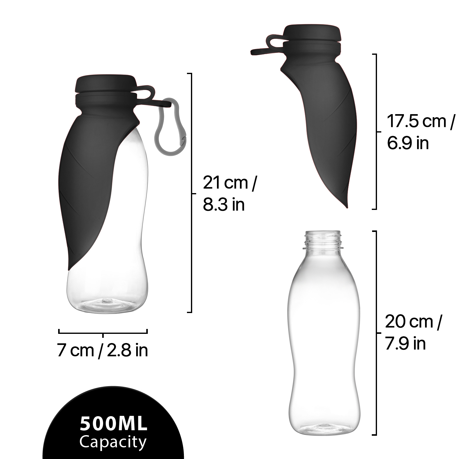 The compact, portable Handi-Drink keeps pets supplied with fresh water on the go. Ideal for walks, hikes, car rides, camping, and trips to the beach. Simply snap the bottle upright into the tray and squeeze the bottle to dispense water into the tray for the dog to drink. The easy-to-use, handheld design includes a plastic 17-oz water bottle, dispenser tray, and cover- Simply snap the bottle upright into the tray and squeeze the bottle to dispense water into the tray for the dog to drink- It includes a convenient belt clip and carrying strap- The bottle folds into the tray for easy portability.