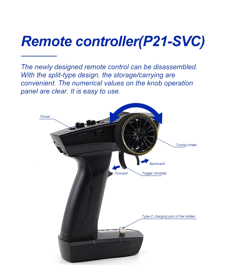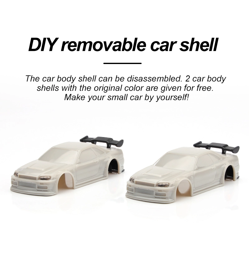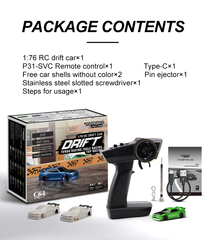 Package Included: 1* Turbo racing 1:76 C64 RC Drift car 1* Turbo racing P21SVC 4CH remote 2* Car shell without color 1* Stainless Steel screwdriver 1* Type C charging cable 1* Packing box 1* User manual