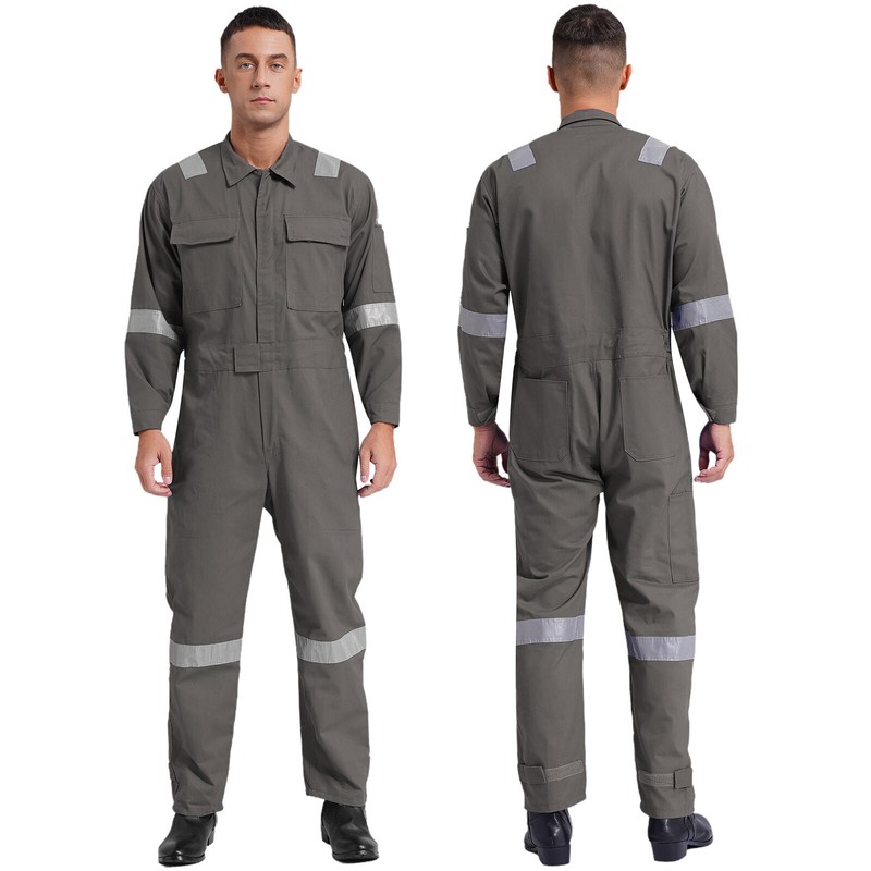 One-piece jumpsuit is designed with lapel, long sleeve, long pants, reflective strips, multiple pockets, front zipper and hook&loop fastener.