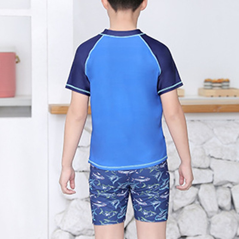 Short sleeve swim tops, elastic waistband trunks and a hat, designed with camouflage or cartoon print.