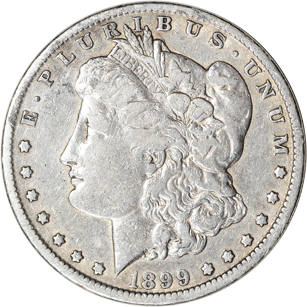 The obverse of the Morgan Dollar features the head of Liberty, facing left. The model for Liberty is believed to be Philadelphia schoolteacher Anna Willess Williams, who had sat for Morgan on several occasions. Liberty wears a Phrygian cap with the word “LIBERTY” on her hair band and various agricultural elements intertwined, including stalks of wheat, bolls of cotton, and leaves of oak. There are seven stars appearing to the left of the portrait and six stars appearing to the right. The inscription “E PLURIBUM UNUM” appears above, with the date below. The designer’s initial, appearing as a single “M,” is found on the truncation of the neck.