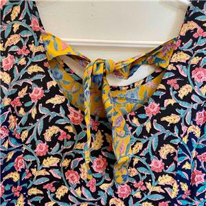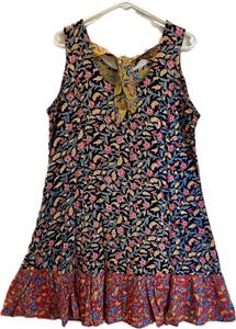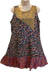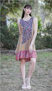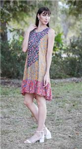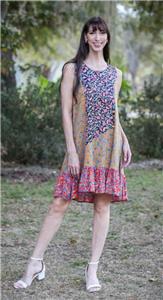 Artsy clothing for expressive women! Presenting classic gypsy hippie chick bohemian shabby chic styles for creative women. Handmade boutique styles at affordable prices. 100% Rayon no match patchwork peasant festival dress featuring tie back neckline in back. This is a cute patchwork dress with a ruffle hemline and falls at about the knee but depending on your height it could fit differently on you. Pay attention to the meaurements. The model is just to show what the item looks like on but the dress hanging in the separate picture is the exact one you will receive. This dress would look great with black leggings or as is. Very versatile. Check the measurements below.