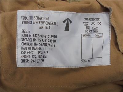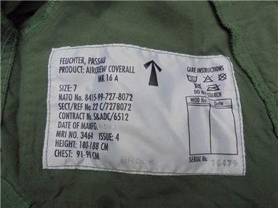 All the Coveralls are in good used condition, with light marking from use. They do vary everso slightly by way of velcro patches and zip colours (either a brass or grey finish) between the sizes. Therefore the one you recieve may differ slightly from the images shown. YOU MAY RECIEVE EITHER A MK16A or 16B AS STOCK IS MIXED AND CHOSEN AT RANDOM FROM SIZE SELECTED