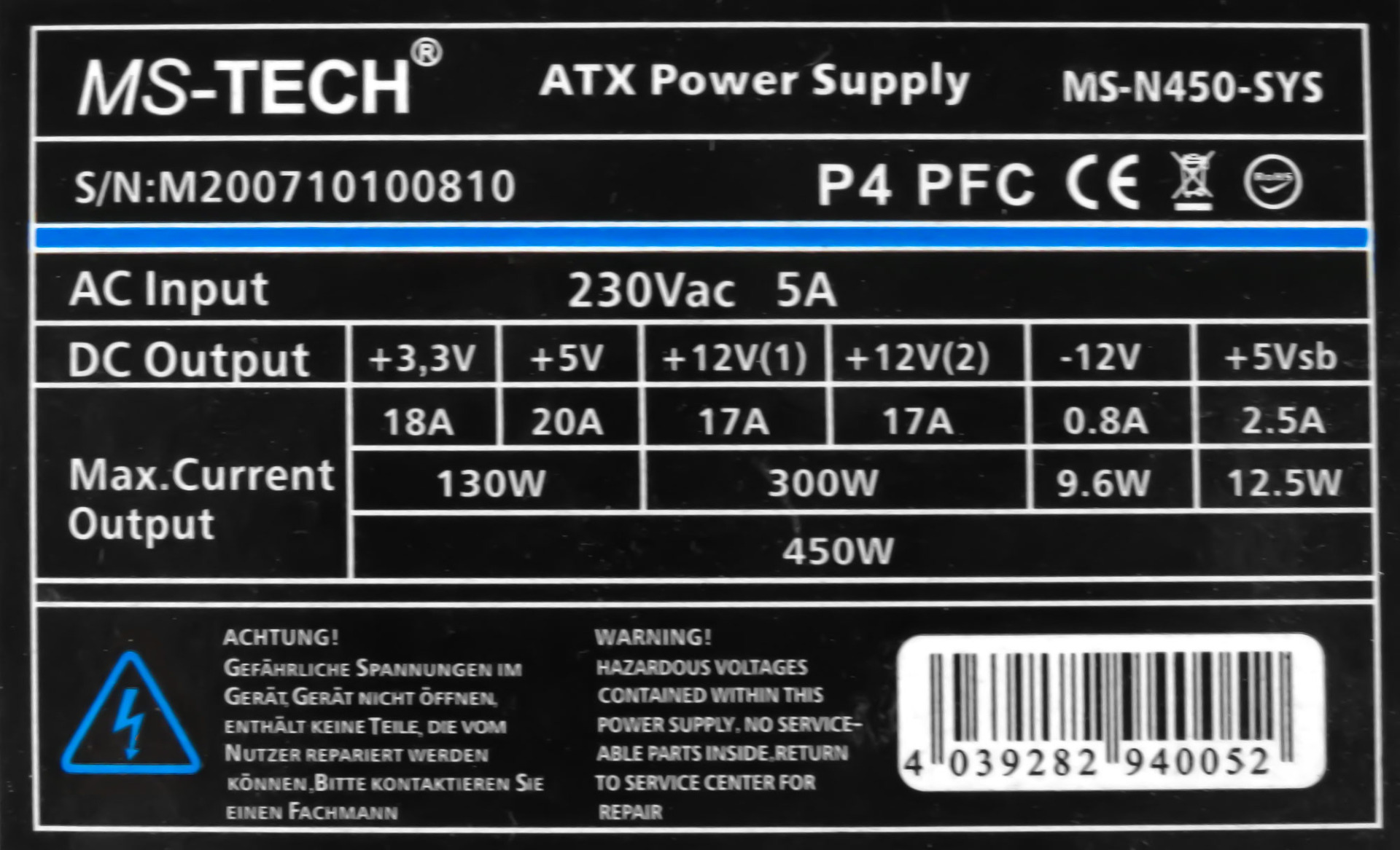 MS-TECH MS-N450-SYS 450W ATX 20+4-PIN