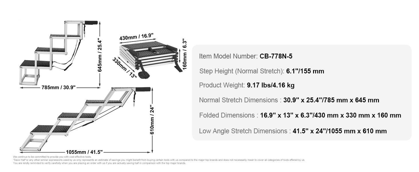 Product Dimensions: At a normal stretch angle, the portable dog steps' length is 30.9"/785mm and the height is 25.4"/645mm. At a lower angle, the length is 41.5"/1055mm and the height is 24"/610mm, making it easy for your pet to access car trunks or side doors.