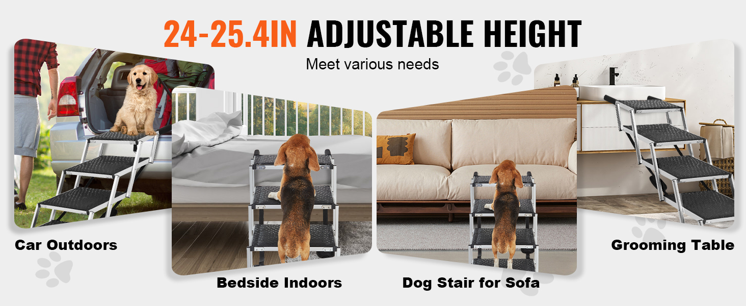 Convenient Pet Access: The 4-step dog stair for cars adjusts in height between 24-25.4 in, making it ideal for small dogs, elderly pets, or injured pets to easily access car trunks, side doors, SUVs, small vans, trucks, beds, sofas, grooming or vet tables.