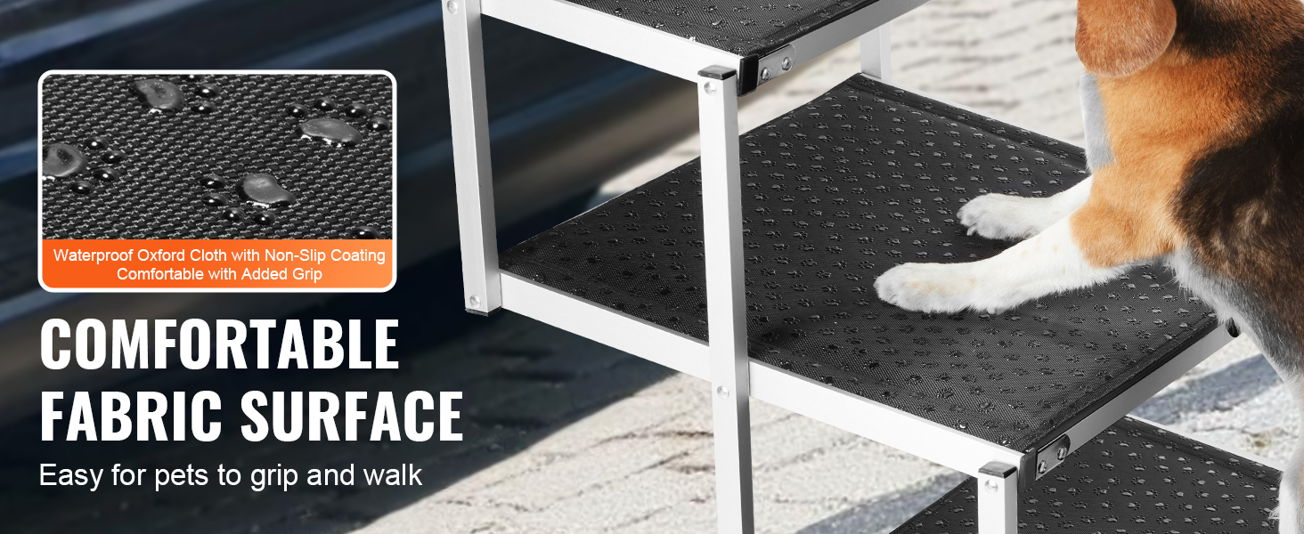 Comfortable Stair Surface: The dog car stairs are covered with polyester fabric, providing a relaxed, non-slip surface that gives your pet's paws good traction for easier climbing. The bottom non-slip pads enhance stability and prevent pets from slipping on the ramp.