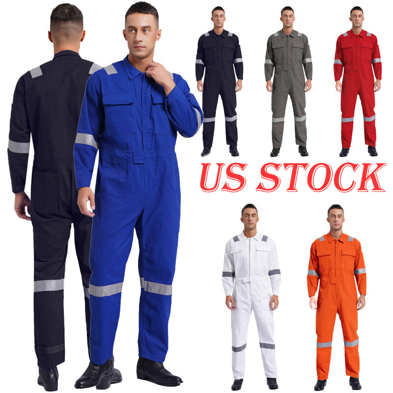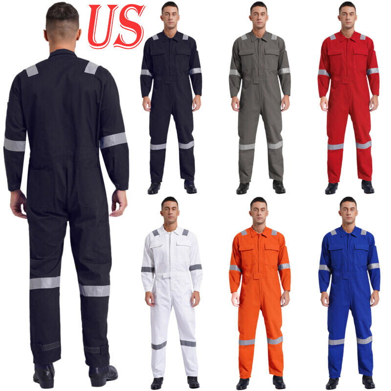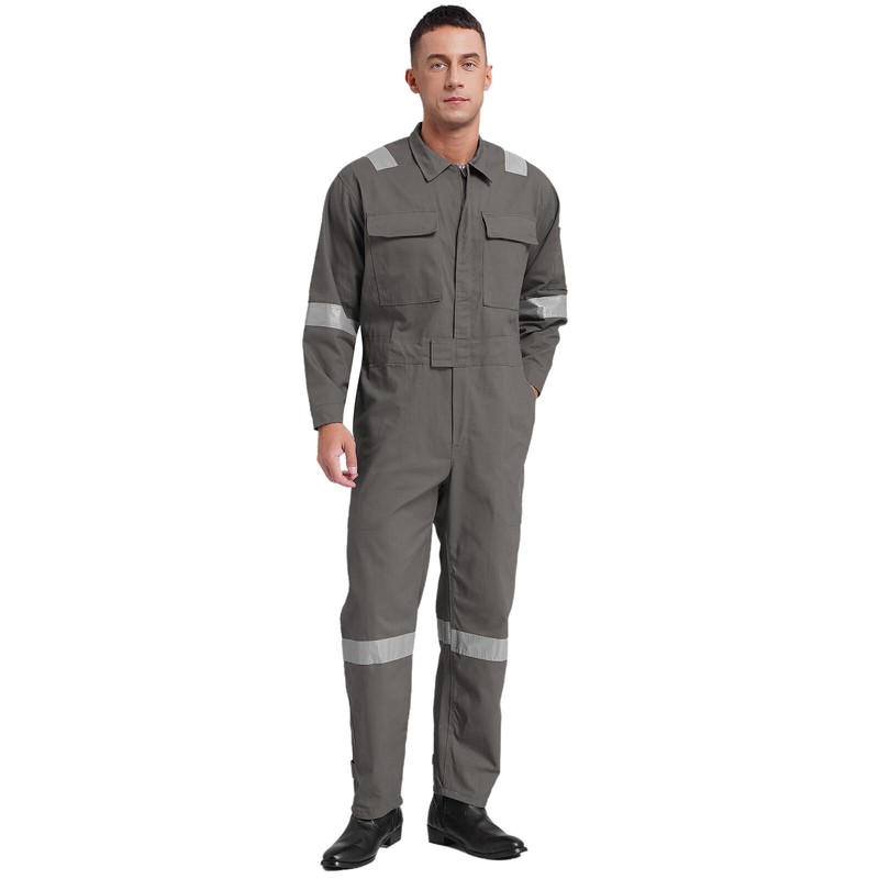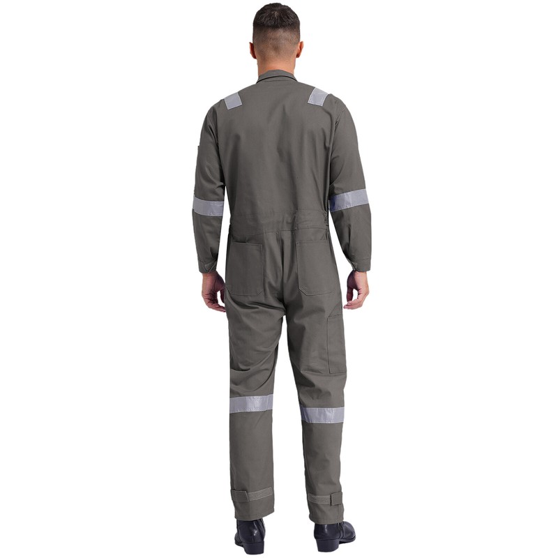 One-piece jumpsuit is designed with lapel, long sleeve, long pants, reflective strips, multiple pockets, front zipper and hook&loop fastener.